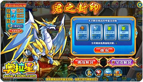 在君之封印的挑战中,我们可以选择帝皇龙的4个技能,要是帝皇龙的几个给力技能不出现,我们获胜的机会就会大大增加了!!!