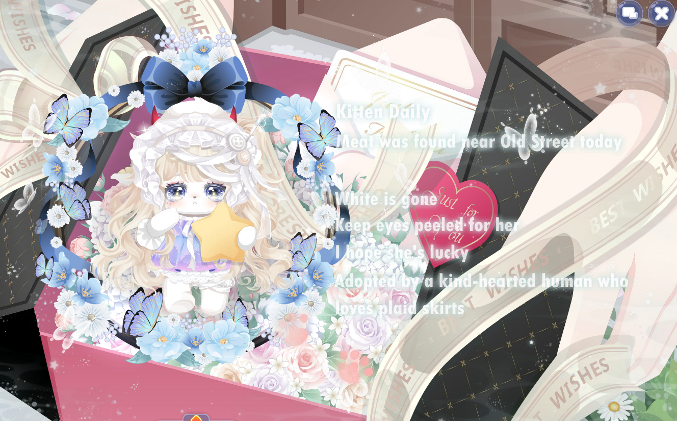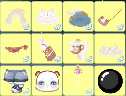 搭配部件:礼盒甜心发箍,烛焰迷失委屈妆,橘猫·安睡,熊市伤心嘴,布娃娃站不稳, 布娃娃纽扣帽, 布娃娃长卷发,睡意小裙子,礼盒甜心背景,礼盒甜心礼盒,猫の梦境碎裂,猫の小猫日报,秋日蝴蝶飞舞,蝴蝶就喜欢你。