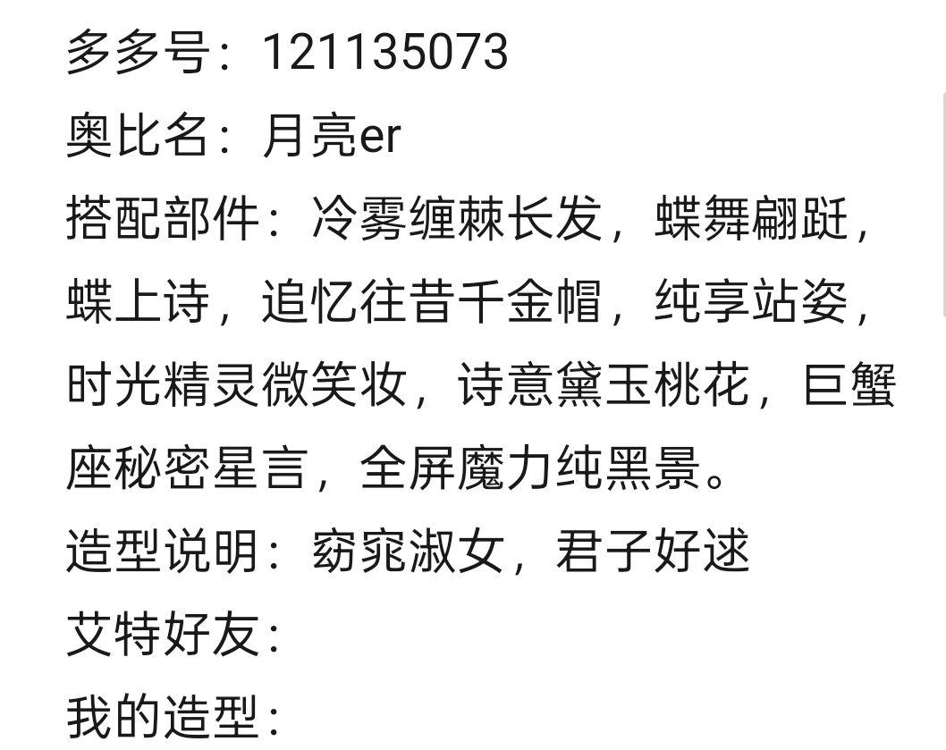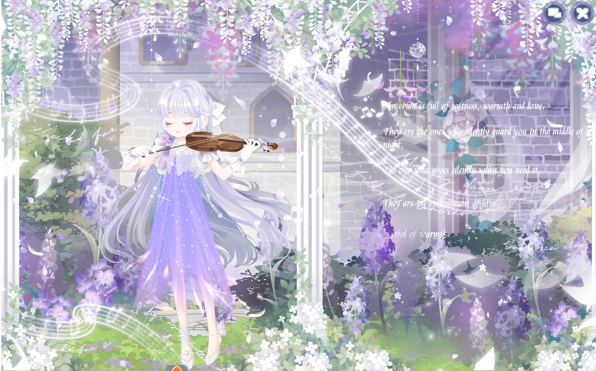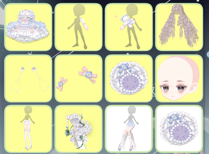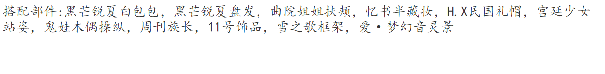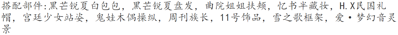 搭配部件:桃也悠悠站姿,朝颜听雨项链,玥·银镜拾光,风信子提琴袖子,再续前缘坎肩,噩梦终端惊讶嘴,纯真花少女头饰,周刊游戏天才,氐星白貉小耳坠,白女巫闭眼妆,缤纷幻想蓝背景,香薰悄待花期,风信子千层花帘,风信子舞曲宫殿,风信子庄园草坪,风信子音乐飞扬,怦然心动花廊,巨蟹座秘密星言,治愈追寻白蝶。