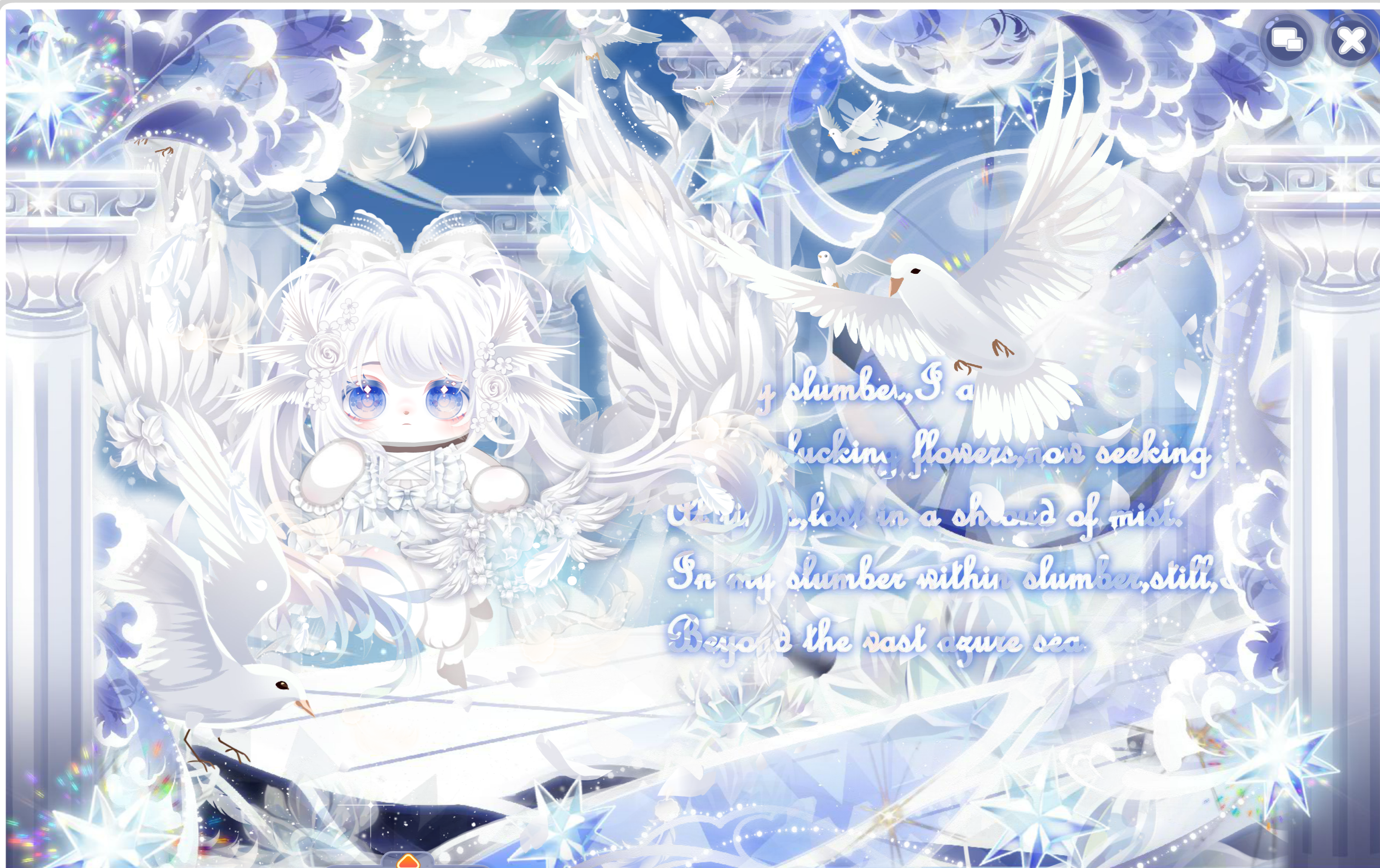 搭配部件:星旅者的辫发、海雾站姿、星雪软云右袖、鱼鱼的白色皮肤、小王子星辰围巾、旧梦星星小发卡、星雨坠落裙子、星雨坠落发饰、爱要说给你听、虚境异客眼镜、彩虹幻想、星海歌姬星碎夹、游雾海落星辰、游雾敛笑凝眸、蓝蔻星辰光效、蓝蔻闪耀炫光、航海星空望远镜、小王子归途流星、流沙浮梦背饰、星河漩涡、天秤座秘密星言、极地·月相流转、繁星夺目领域、玫瑰王子星球、迷途星球漂浮