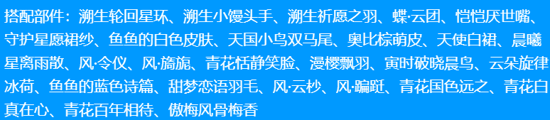 搭配部件:葡萄呆呆、复苏、夏日酣睡右袖、爱要说给你听、微光薰衣草裙、微光薰衣草头饰、晨光精灵纱裙、奥比棕萌皮、花落铃兰翅膀、海风听琴小提琴、晨曦星离雨散、极地·奔赴夜晚、雪国列车童谣、秋日蝴蝶飞舞、微光薰衣草、繁星精灵邀约、星星月夜闪闪、星星为谁歌唱、星星演奏乐曲、蝶灵序曲光蝶、薰衣梦境紫藤树、傲梅风骨梅香、星星珠帘、紫藤萝花海