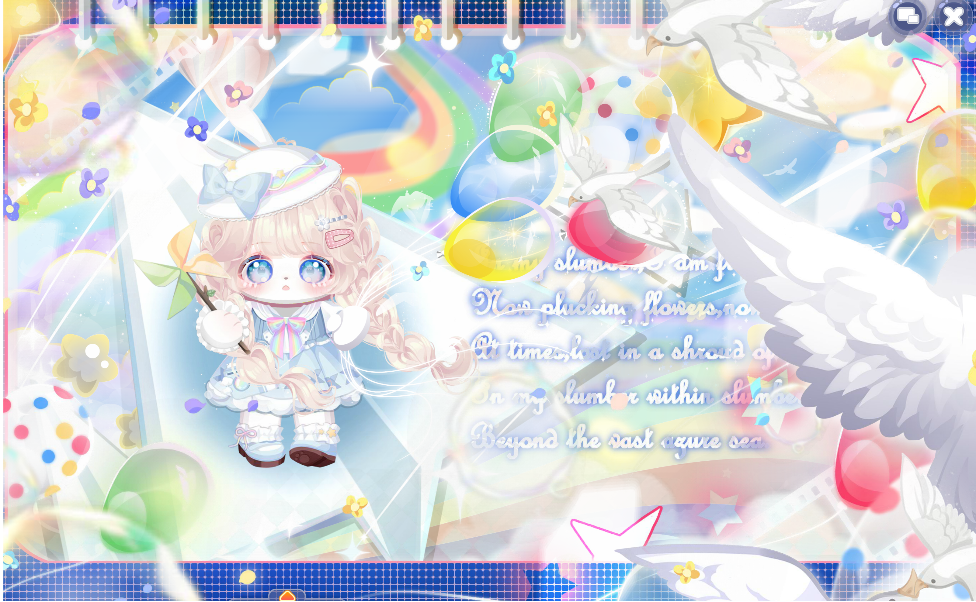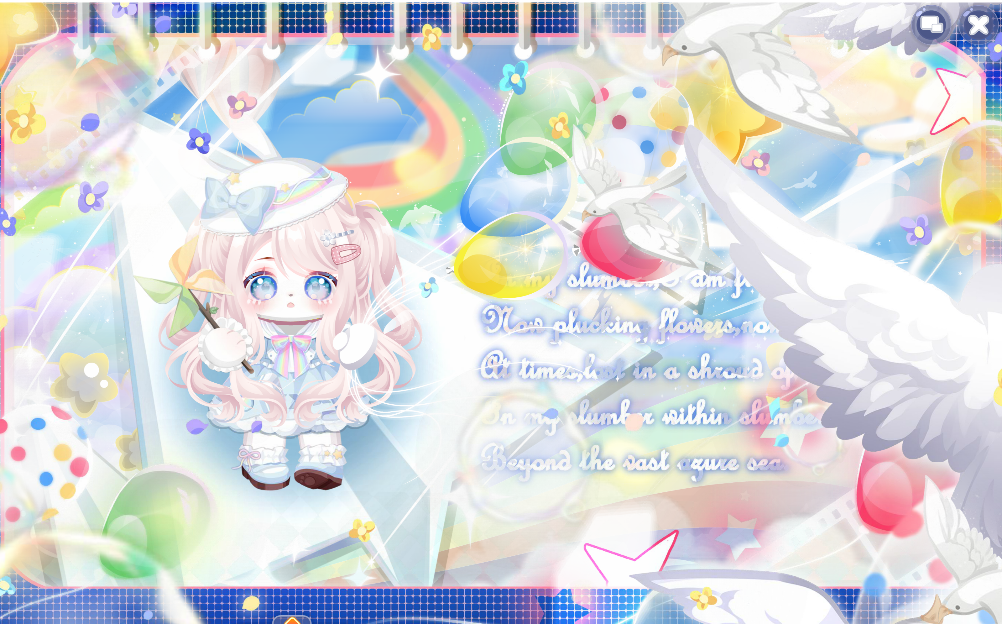 搭配部件:闪闪云相机、绵绵云裙子、绵绵云站姿、绵绵云帽子、风眠纸飞机手持、爱要说给你听、熊市好好捯饬了、奶油泡芙表情、滨海海风气球、乖巧女学生发夹、草莓果酱害羞羞、花漾幻庭光效、剑翎御冕光效、风眠纸飞机背饰、鱼鱼的蓝色诗篇、粉兔之家阳光、闲暇时光彩虹、滨海夏日记录、七彩独角兽云雾、日落小画家彩虹、奥比热气球、初恋心动云朵、晴日兔粉背景