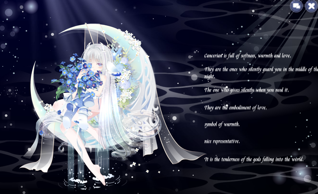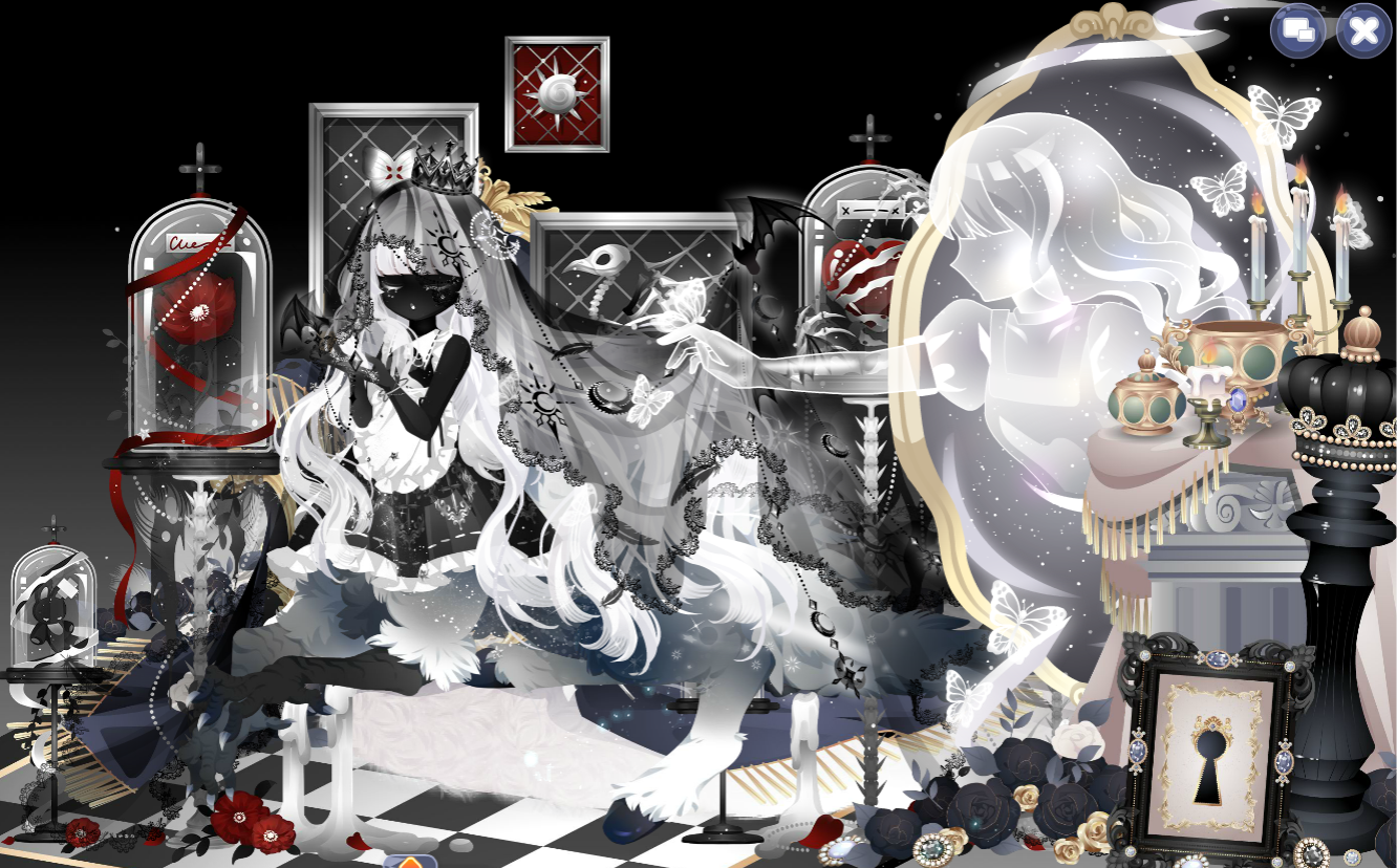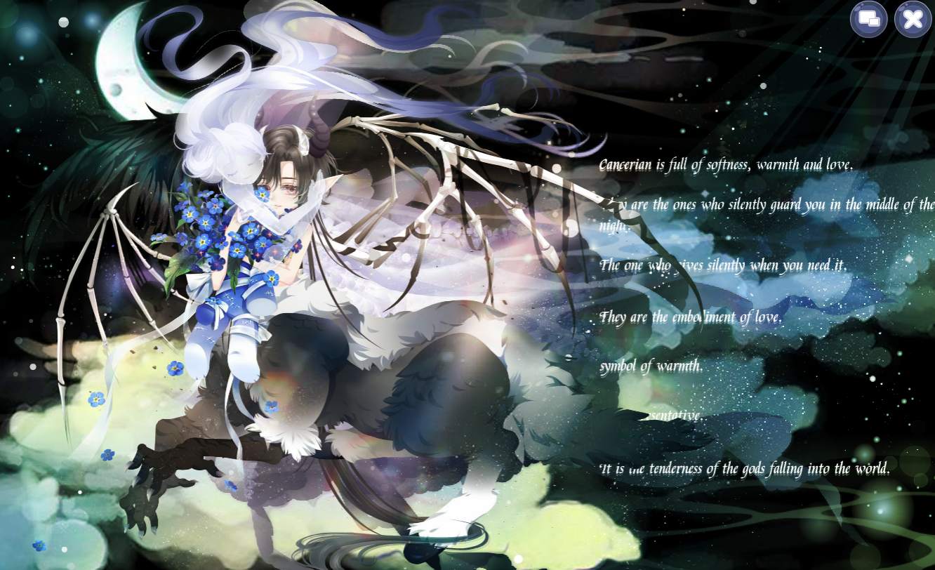 搭配部件:绮美拉的兽躯,绮美拉的花束,月·蚀月残翼,月·聆星耳,大乌鸷弥城长发,挽月泪妆,恋人等待妆,古希腊信使半身,摩羯鬣羊羊角,水晶恶魔角,巨蟹座秘密星言,昼夜之心,落樱阳光洒落,白夜憧憬背景
