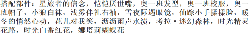 搭配部件:遇见·听歌吗、遇见·小啾啾、夜·点金、温暖时尚下装、下雨天雨伞、乌鹭迷城秘境、夜·不眠、夜·咒语、挽月飞鸟、挽月梦满枝、落樱阳光洒落、夜半滨海公路、夜半疏璃机车