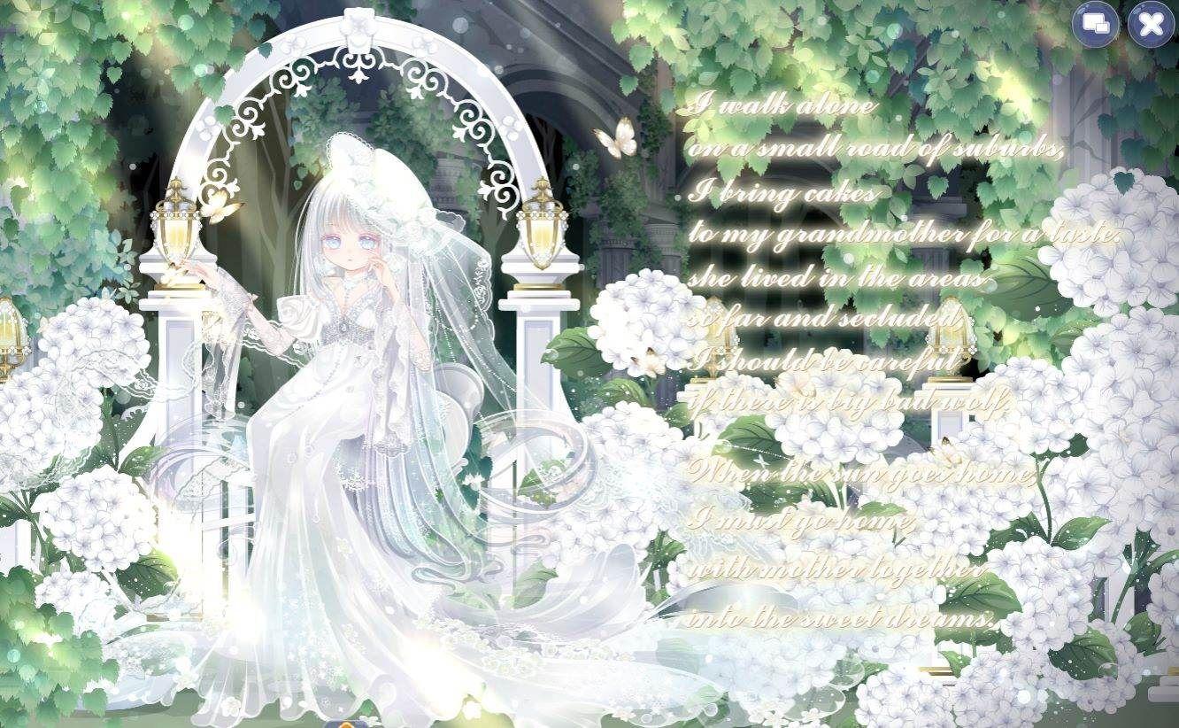 搭配部件:怜·钻石项链,怜·薄纱飘带,怜·垂怜纱饰,蝶·玉容,祷歌与泪残柱,祷歌与泪裙,留声萦年害羞,留声萦年受约,瞬·时光守护长发型,云鸢寄心蝶语,祷歌与泪背景,祷歌与泪光效,绣球花篱笆背饰,狼少女诗句