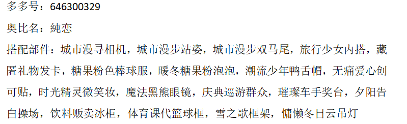 搭配部件:冬意融融发,风拂夏息蓝纱裙,玩偶大战站姿,甜心巧克力左袖,守护童心兔耳帽,生之礼赞开心笑,时光精灵微笑妆,魔法黑熊眼镜,甜心纵享丝滑,甜心梦境融化,表白爱意字母箱,表白爱意迎宾牌,爱意表白星串灯,爱意表白气球堆,爱意表白透纱帘,红丝绒礼物堆,红丝绒气球猫,烛光生日晚餐桌,生日温馨小屋,星河懒人沙发,星河套房内室