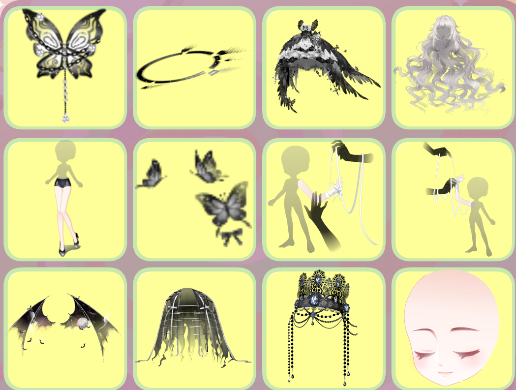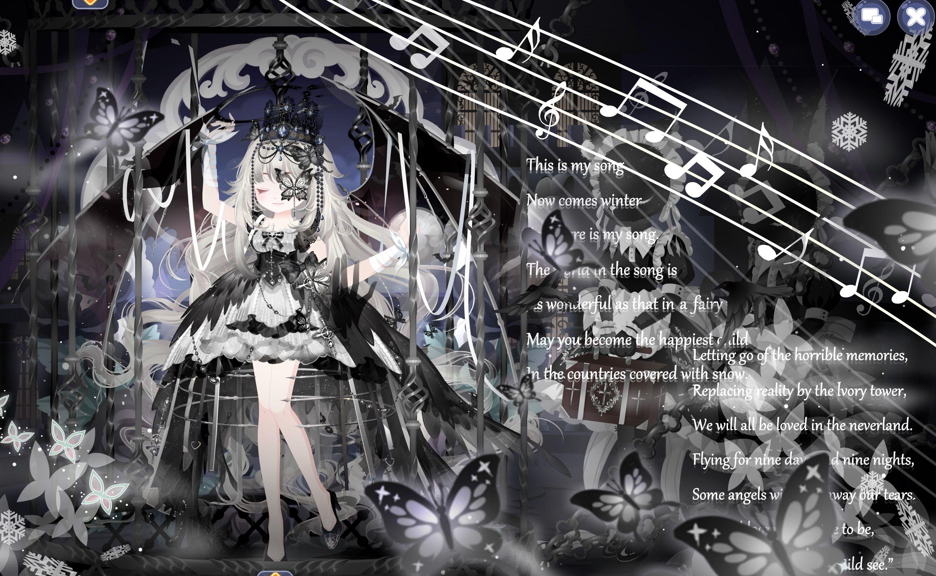 搭配部件:堕落幻蝶眼饰、堕落黯陨黑环、堕落沉蝶影裙、堕落溯影霜发、夜冕绘梦站姿、陌·引蝶、奥莉安娜拉扯、奥莉安娜束缚、鬼魅·夜幕降临、鬼魅·绞杀爱意、古堡人偶皇冠、白女巫闭眼妆、夜·迷雾、夜·女仆、陌·戏蝶、陌·镜花、契约牢笼、幽蝶女王吊链、夫人·末日使者、雪之歌框架、美狄亚女巫背景
