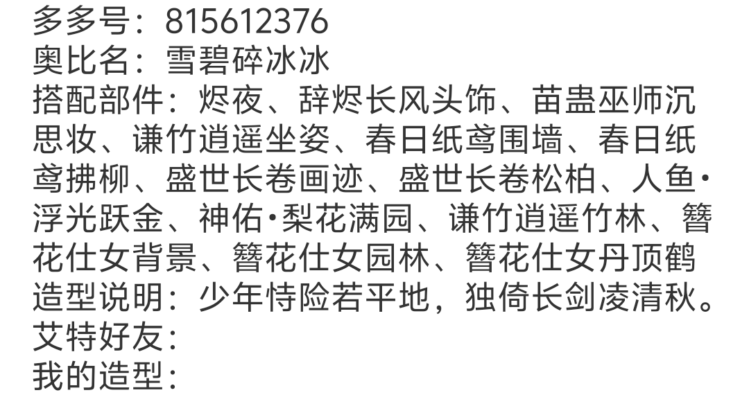 搭配部件:月绫青衣右袖、月绫青衣左袖、月绫青衣裙、月绫青衣发型、雪国列车拖纱、宝石精灵表情、蝶•垂泪、蝶•花颜、雪落长安诗句、绿熊粉色fafa、雪中寻梅背饰、抚琴赏月许愿灯、抚琴赏月湖景、龙宫幽静烟袅绕、散落樱花水面、燃樱古灯、樱花古道、巳时瑞蛇布幕