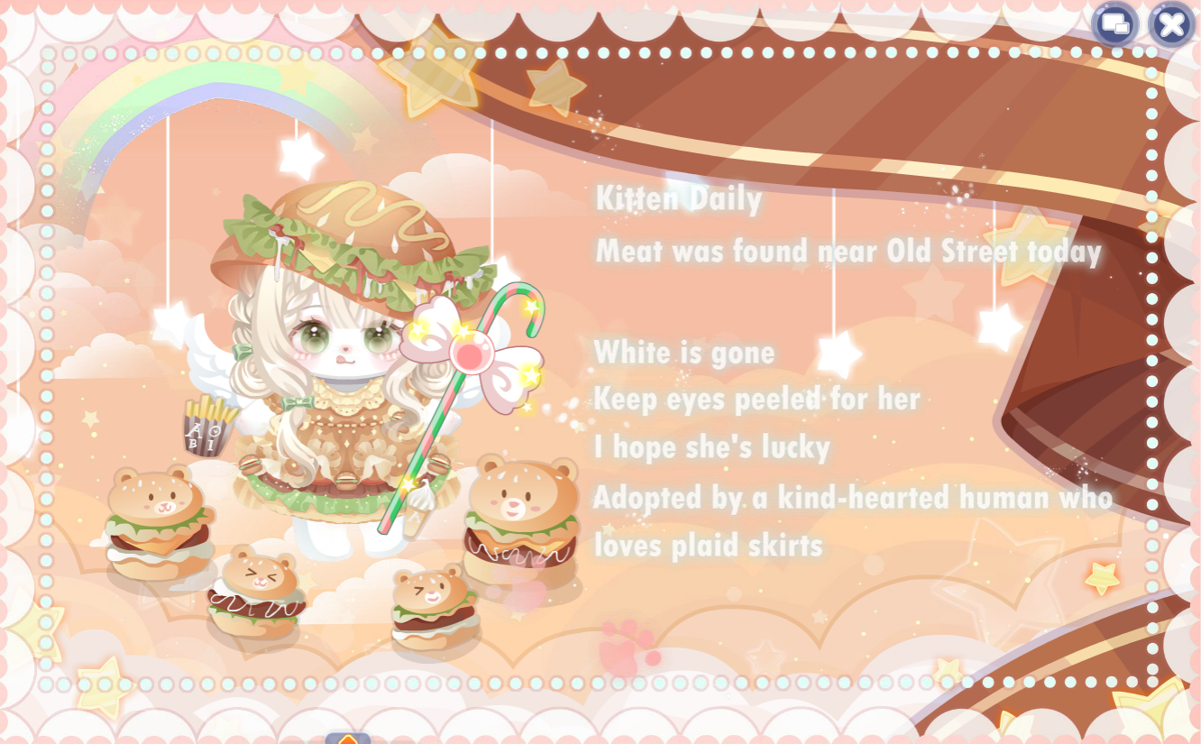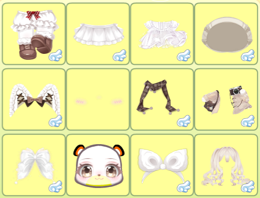 搭配部件:缤纷采购小提篮、秋日曲奇围巾、临停航班裙子、鱼鱼白色皮肤、小熊的西高地、酷酷小熊马甲衣、上学日记站姿、苹果女孩表情、苹果女孩卷发、幸福定格帽子、草莓果酱害羞羞、毛织男友耳机、夏·煜煜生光、夏·年少友人、霜雪玩偶地毯、霜雪玩偶背景、花房姑娘桌椅、手账小画家架子、金牛熊熊货物架、金牛熊熊收银台、萌宠咖啡厅角落