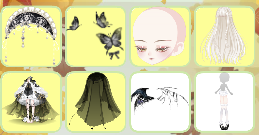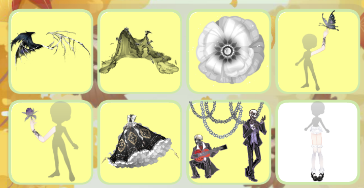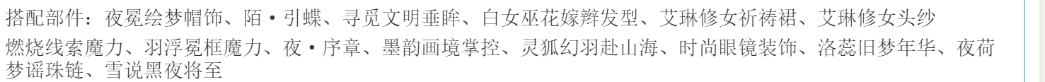 搭配部件:月·蚀月残翼、月·暗涌纱、不要午夜入睡、紫韵凝香停留、紫韵凝香绽放、夜·礼服、宗罪舞台骷髅