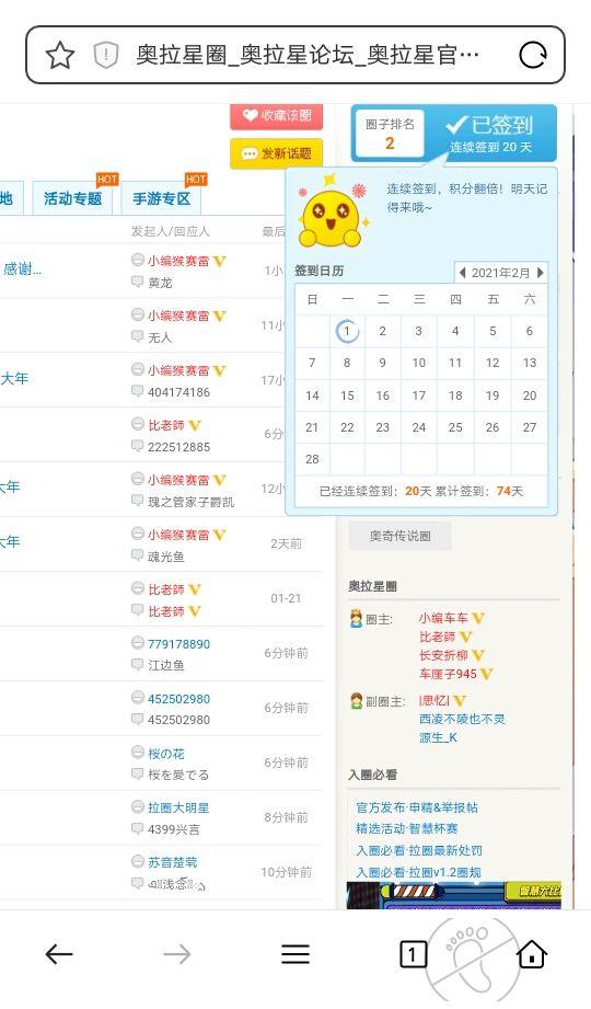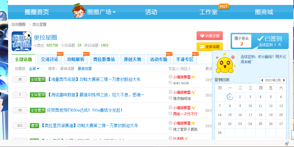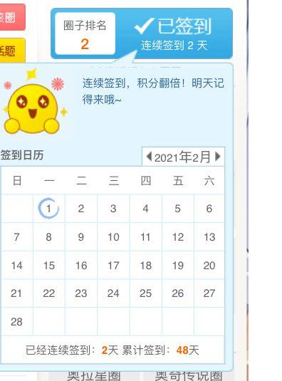今天是2月1日,奥拉星圈签到第2天,加油鸭