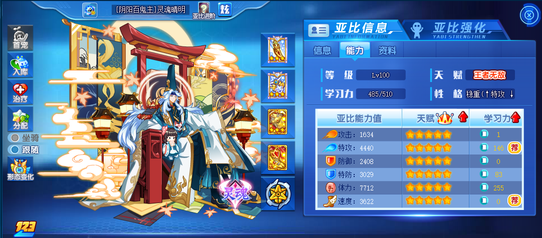 图,这是我的晴明,差的这整整两千血你告诉我有什么办法能补上?所以晴明必须带巨化才能开场万血,铭文带了体力,铭文副词条也刷的体力,血量应该还可以再高一点,但不可能再高两千啊。。。
