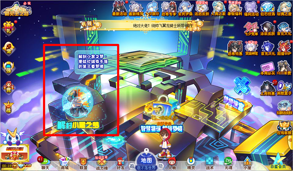 描述:玩找星星的游戏获得小星元,通过第四关获得精灵『小黑』,首次全部解封小黑梦境即可开启夜不落世界全部区域。首次通过“智慧猜谜 解锁梦境”、“梦境迷宫”和“解封小黑之梦”3个游戏即可获得大奖。