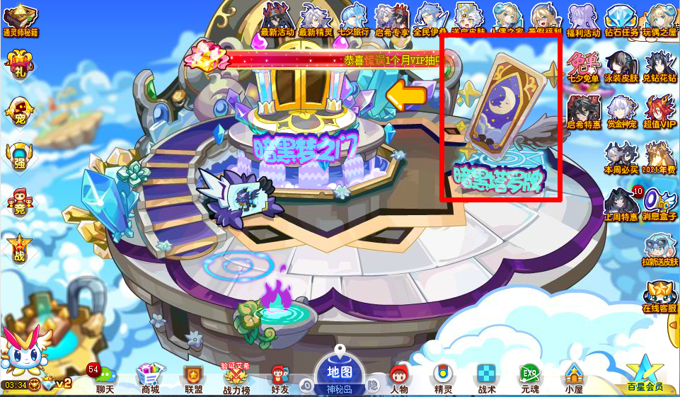 描述:花费100金币翻塔罗牌,可获得资源或若干黑水晶,50个黑水晶可以将小梦进化为暗黑梦梦,