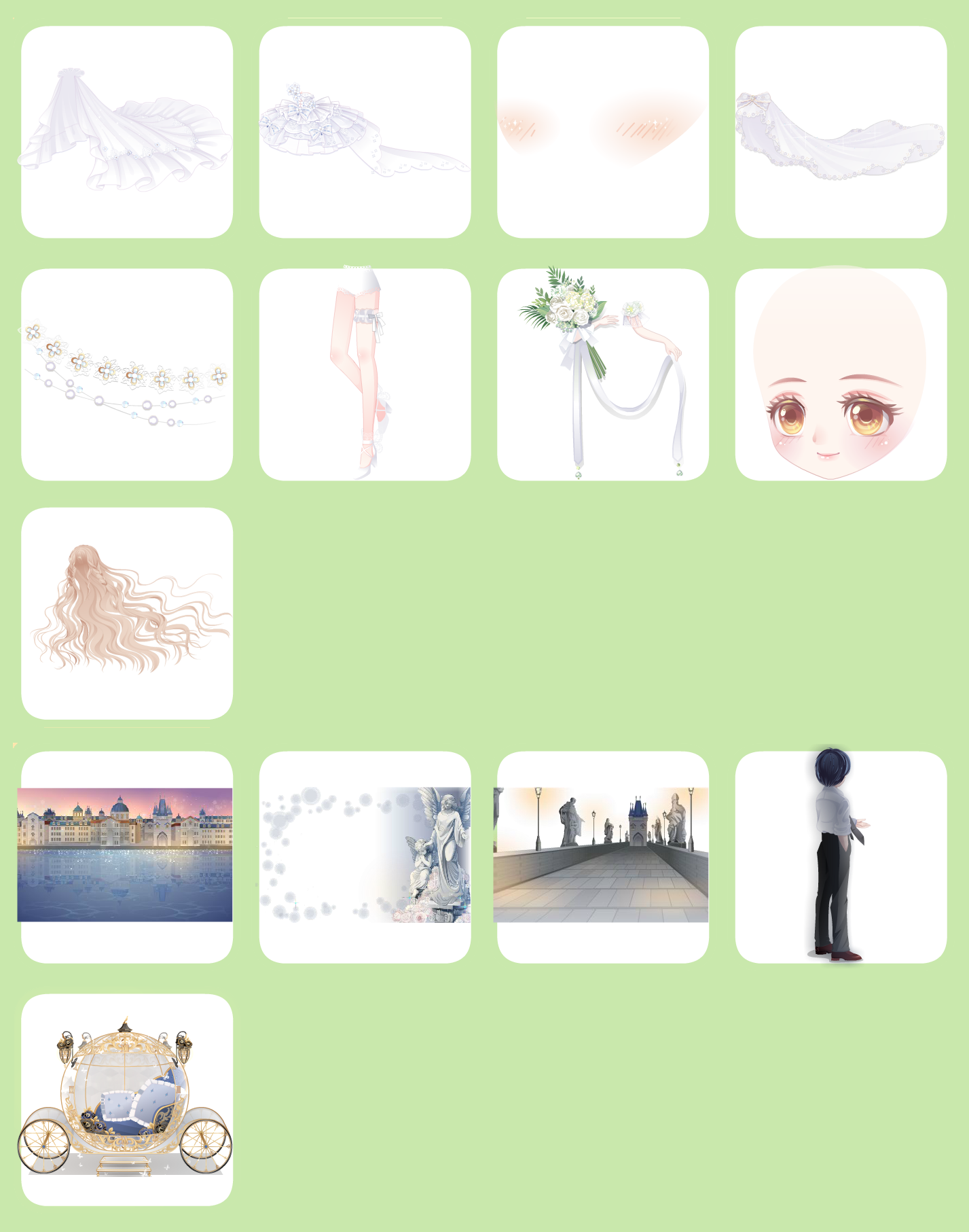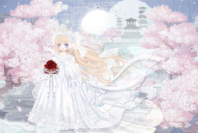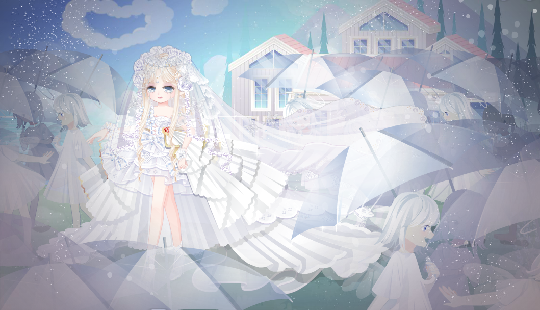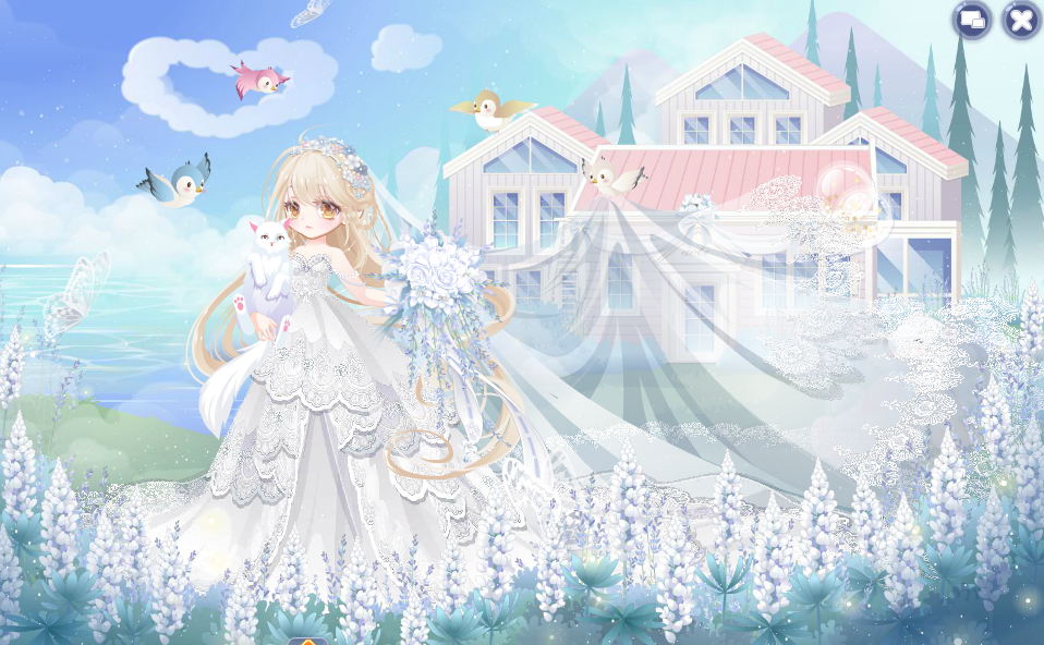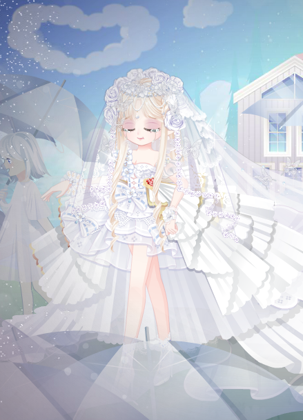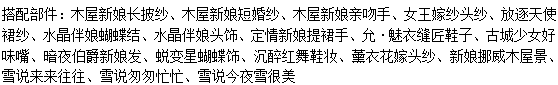 搭配部件:木屋新娘捧花、木屋新娘捧花手、誓约新娘婚纱、誓约新娘头纱、x.y花钻头饰、魅洋之漩圣灵发、珠宝大小姐表情、复古明星小白猫、新娘挪威木屋景、木屋新娘惬意熊、木屋新娘鲁冰花、奇美拉大蝴蝶