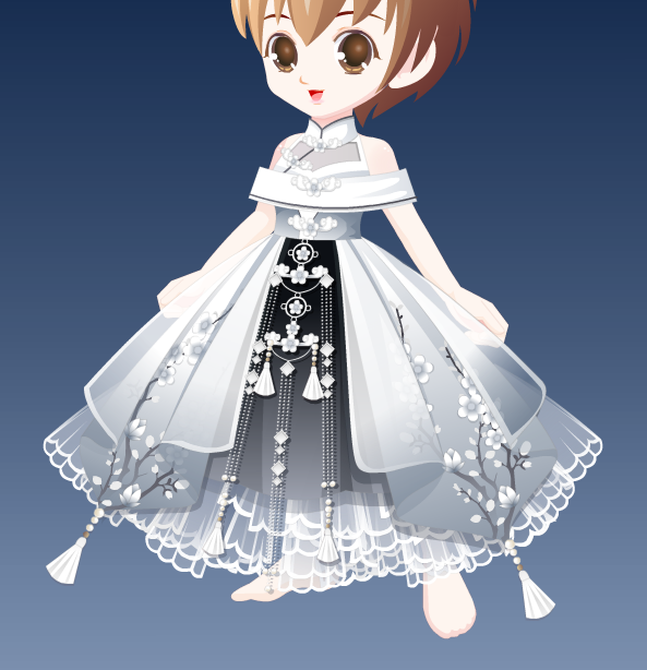 水墨色,偏温婉精致吧,因为设计风格的原因又带点古风.层层的水墨色裙摆叠起,不仅增添了几分层次感,同时还使裙子显得更加精致.裙尾处的梅花勾画细致,裙子本身还隐隐有细碎的流光!