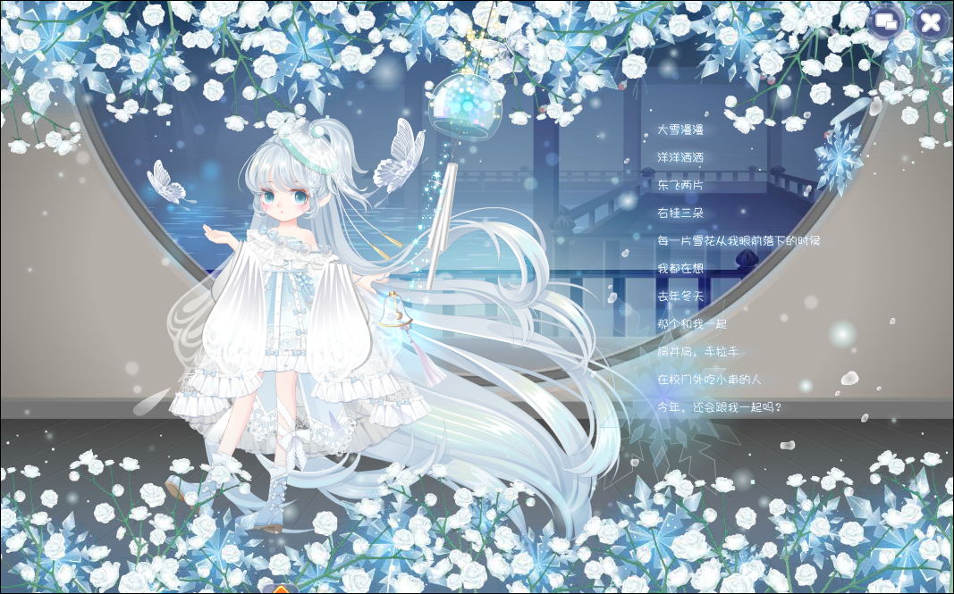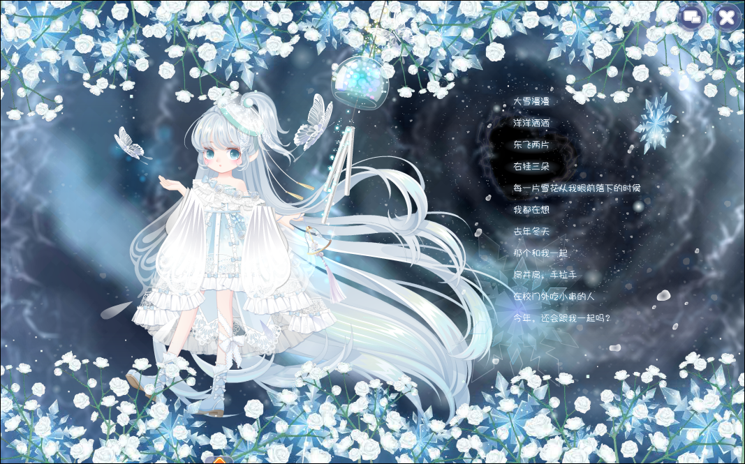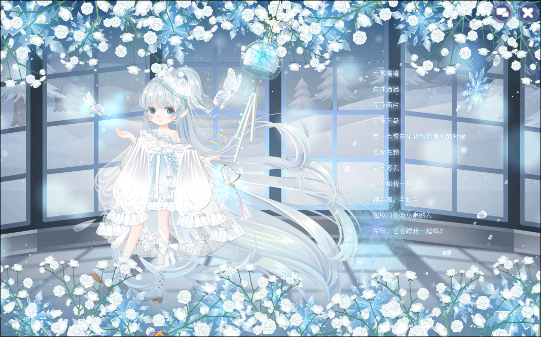 在现代的家里摆弄祖辈传下来的一直古朴且从没有声音的风铃,突然有几只清亮透明的蝴蝶振翅飞出来,蓝白色的冰霜和花朵猝然开放,风铃竟也随之响动散发荧光,露出它本来的面貌