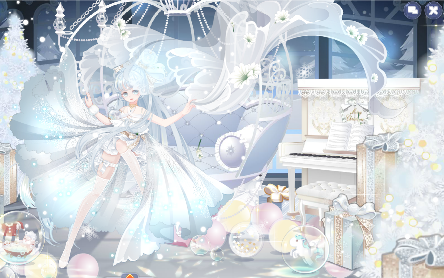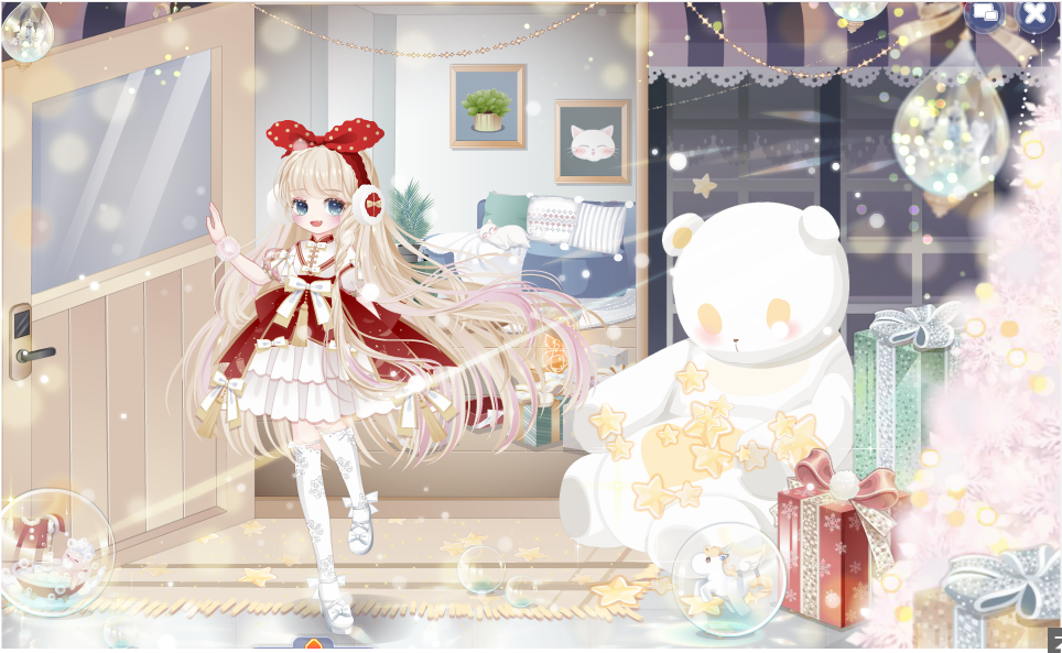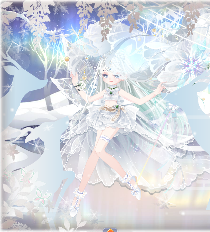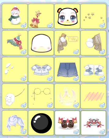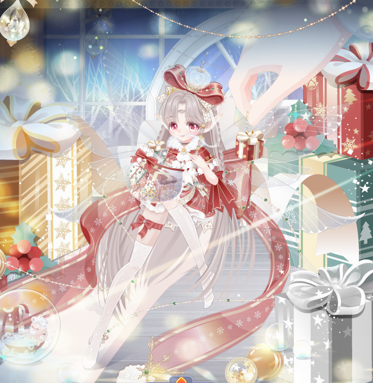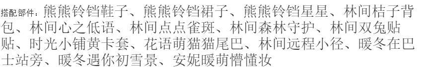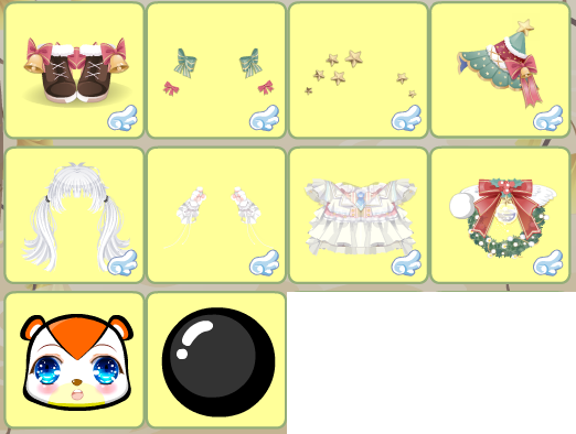 搭配部件:熊熊铃铛鞋子、熊熊铃铛发饰、熊熊铃铛星星、熊熊铃铛帽子、林间雪原守护、乖喵粉嫩小爪爪、乖喵元气打歌服、圣诞限量风铃、晶钻公主表情、神射之马飘雪、雪国惊喜回忆、圣诞彩色装饰框、纯黑