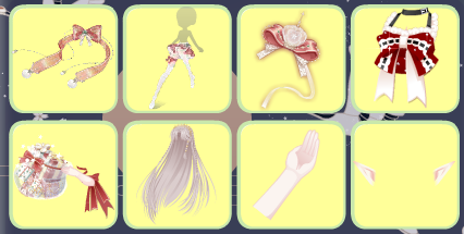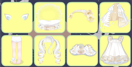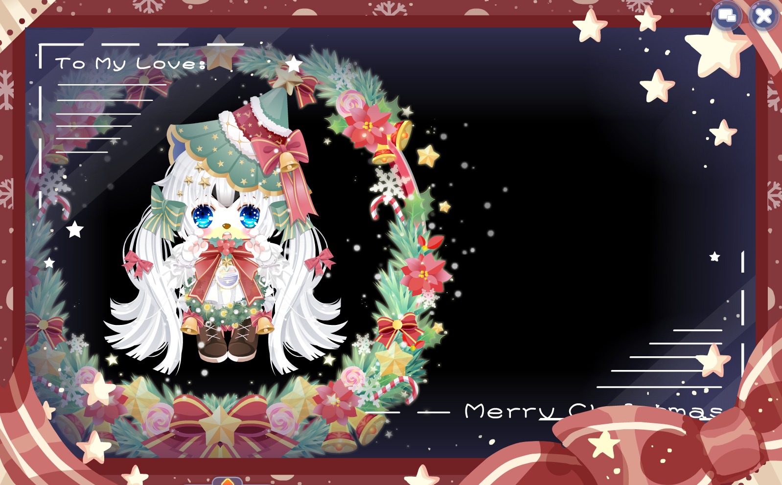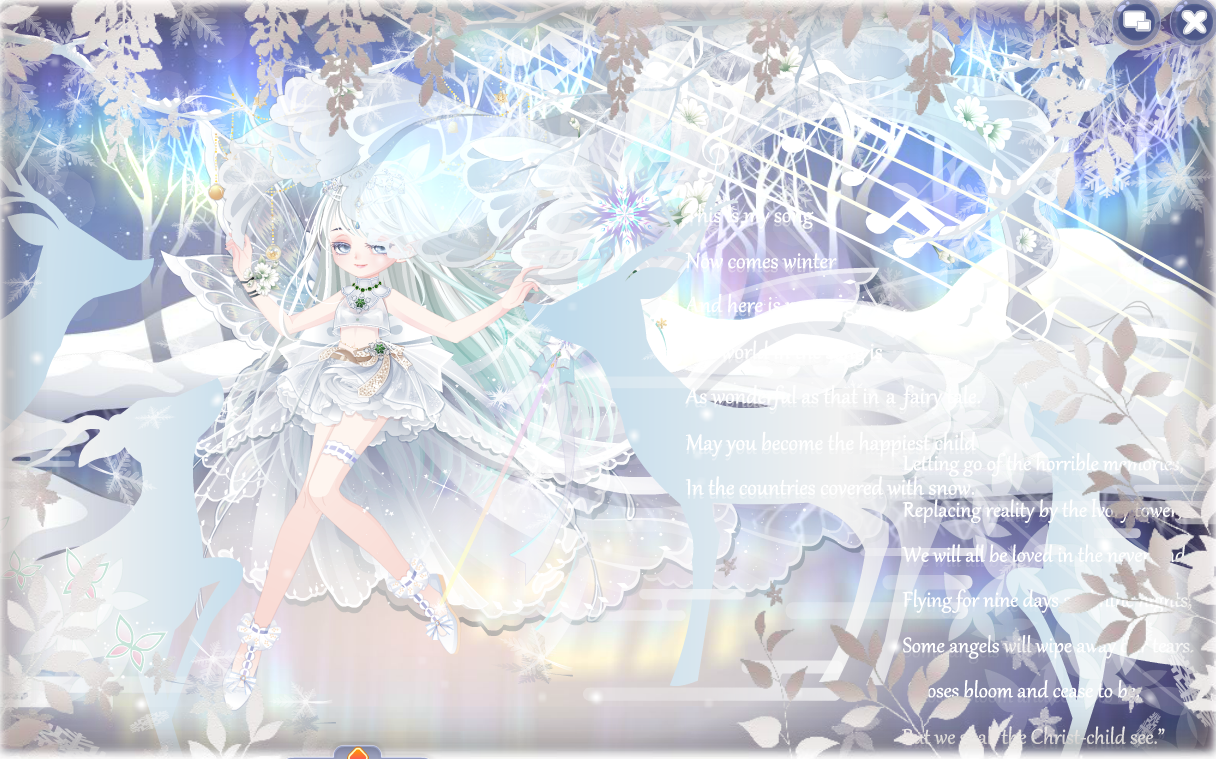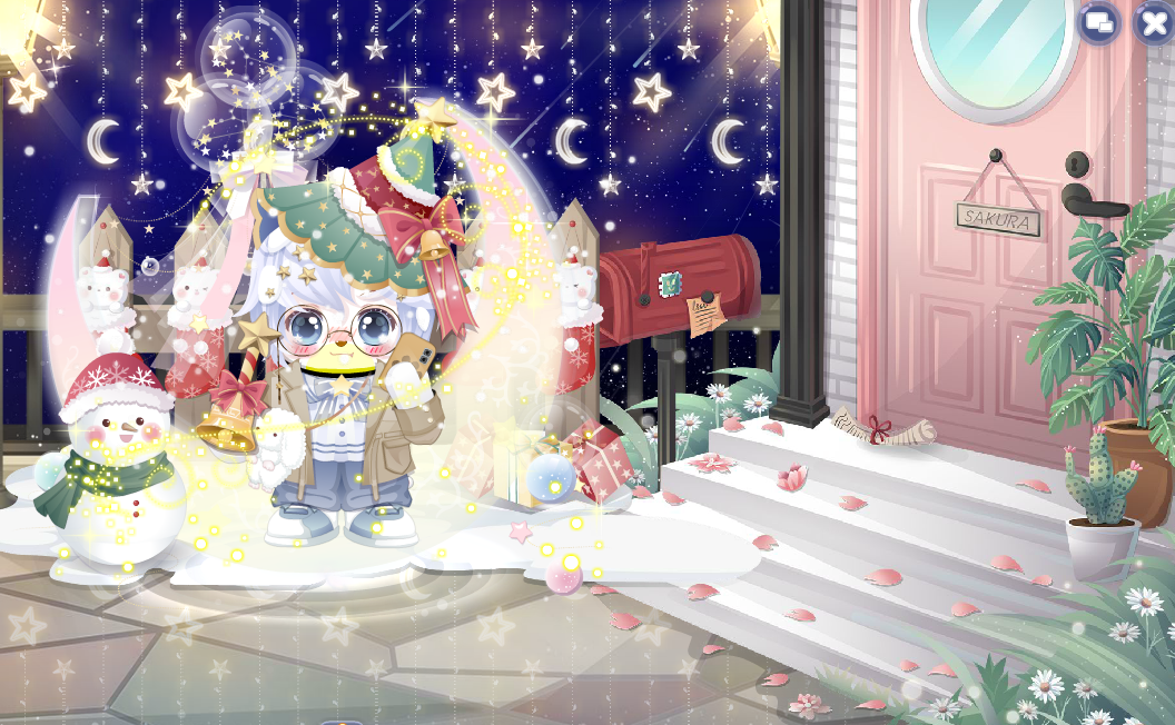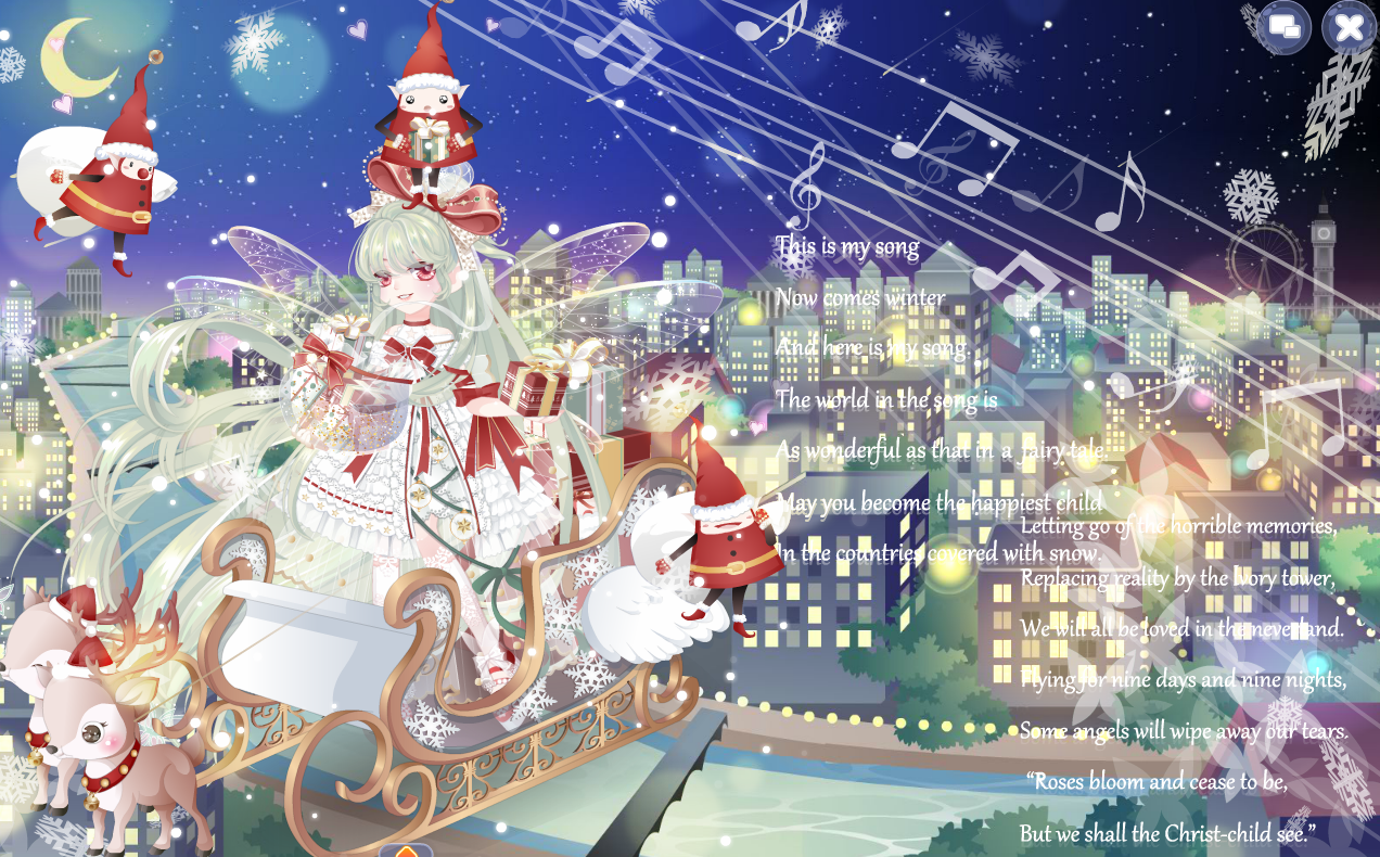 搭配部件:熊熊铃铛鞋子、熊熊铃铛发饰、熊熊铃铛星星、熊熊铃铛帽子、林间雪原守护、乖喵粉嫩小爪爪、乖喵元气打歌服、圣诞限量风铃、晶钻公主表情、神射之马飘雪、雪国惊喜回忆、圣诞彩色装饰框、纯黑