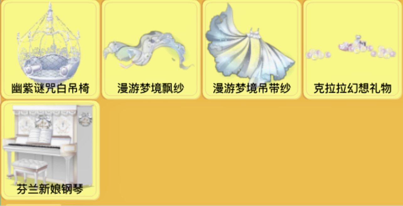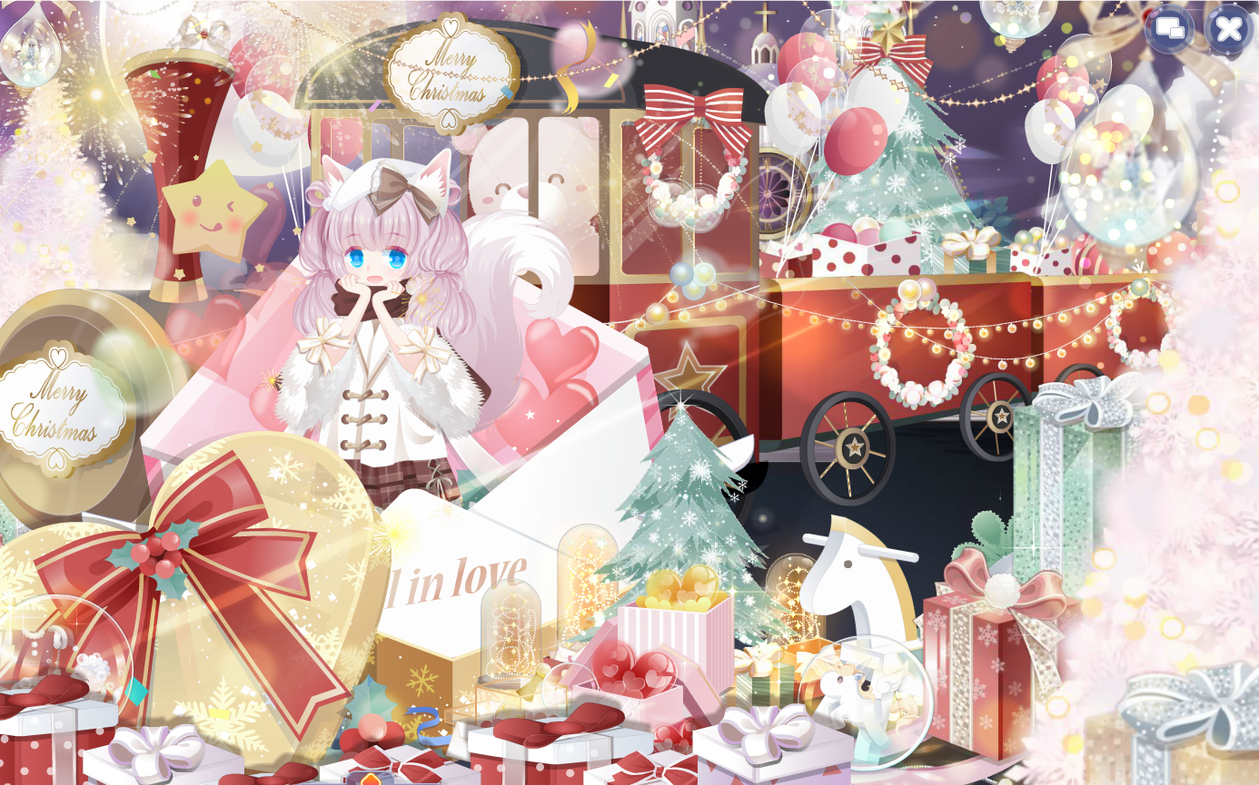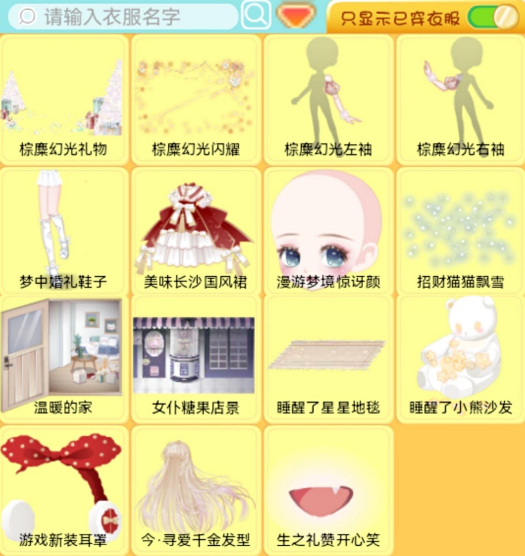 搭配部件:棕糜幻光礼物 棕糜幻光闪耀 棕糜幻光左袖 棕糜幻光右袖 梦中婚礼鞋子 美味长沙国风裙 漫游梦境惊讶颜 招财猫猫飘雪 温暖的家 糖果店景 睡醒了星星地毯 睡醒了小熊沙发 游戏新装耳麦 今·寻爱千金发型 生之礼赞开心笑