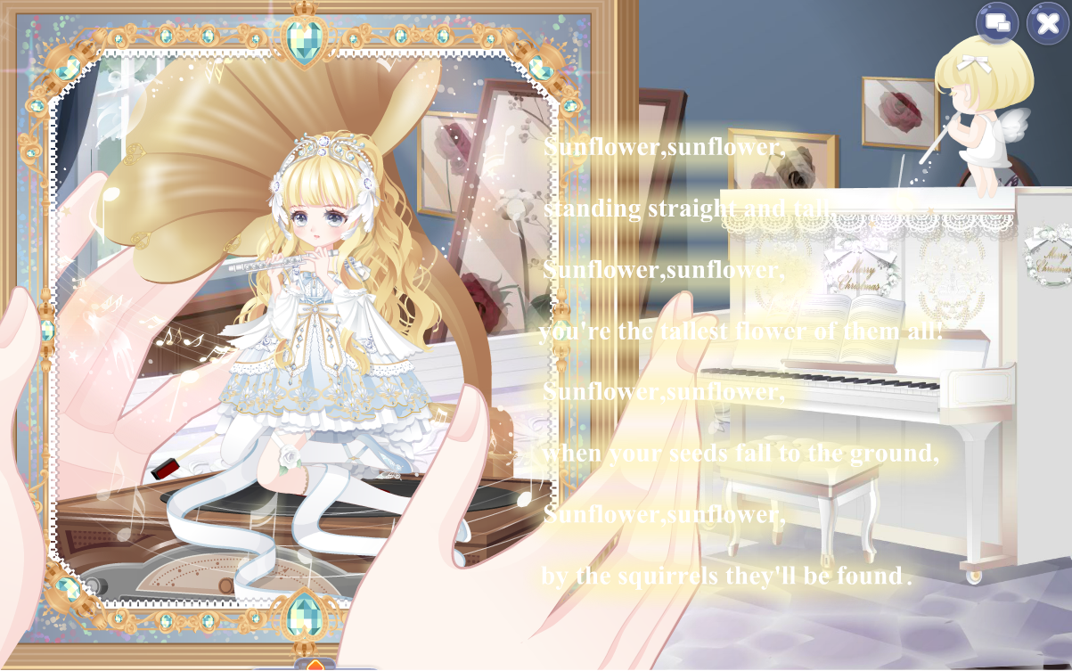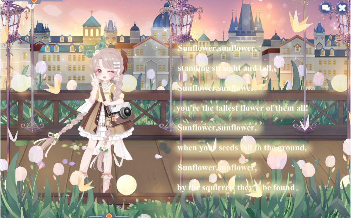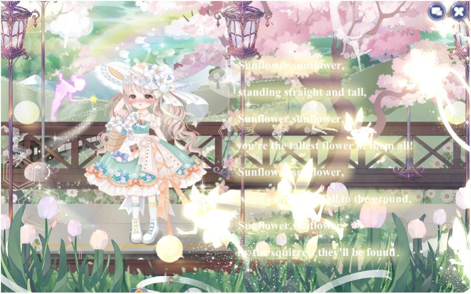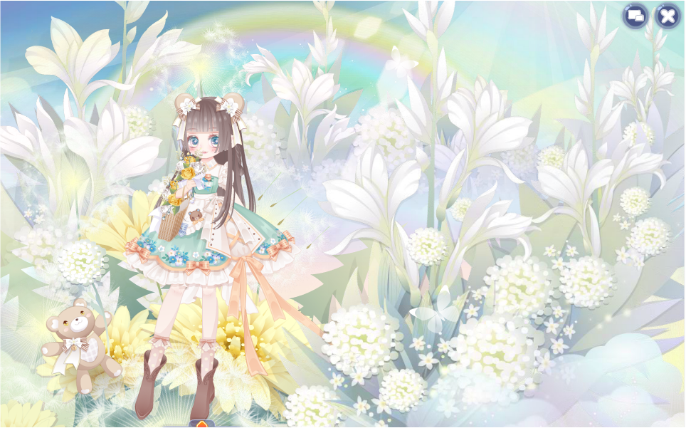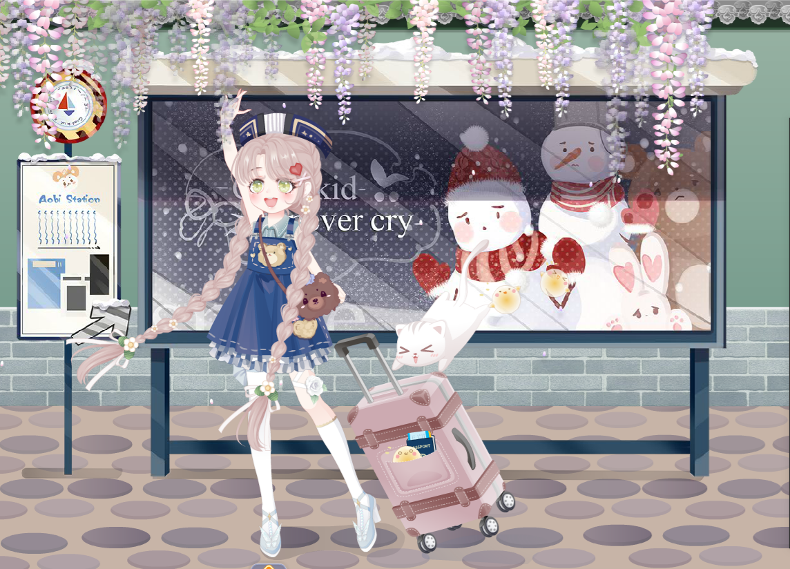 搭配部件:圣之诗礼帽、芭蕾右迎姿、假日丽春发夹、假日丽春行李箱、假日丽春双马尾、时空旅人站姿、沪动游记表情、纸短情长蜜熊包、蛙屿孩童的衣服、西部牛仔无袖装、春日之森宫墙纸、春日之森褐地板、雪说未来会更好、温柔插花师花藤