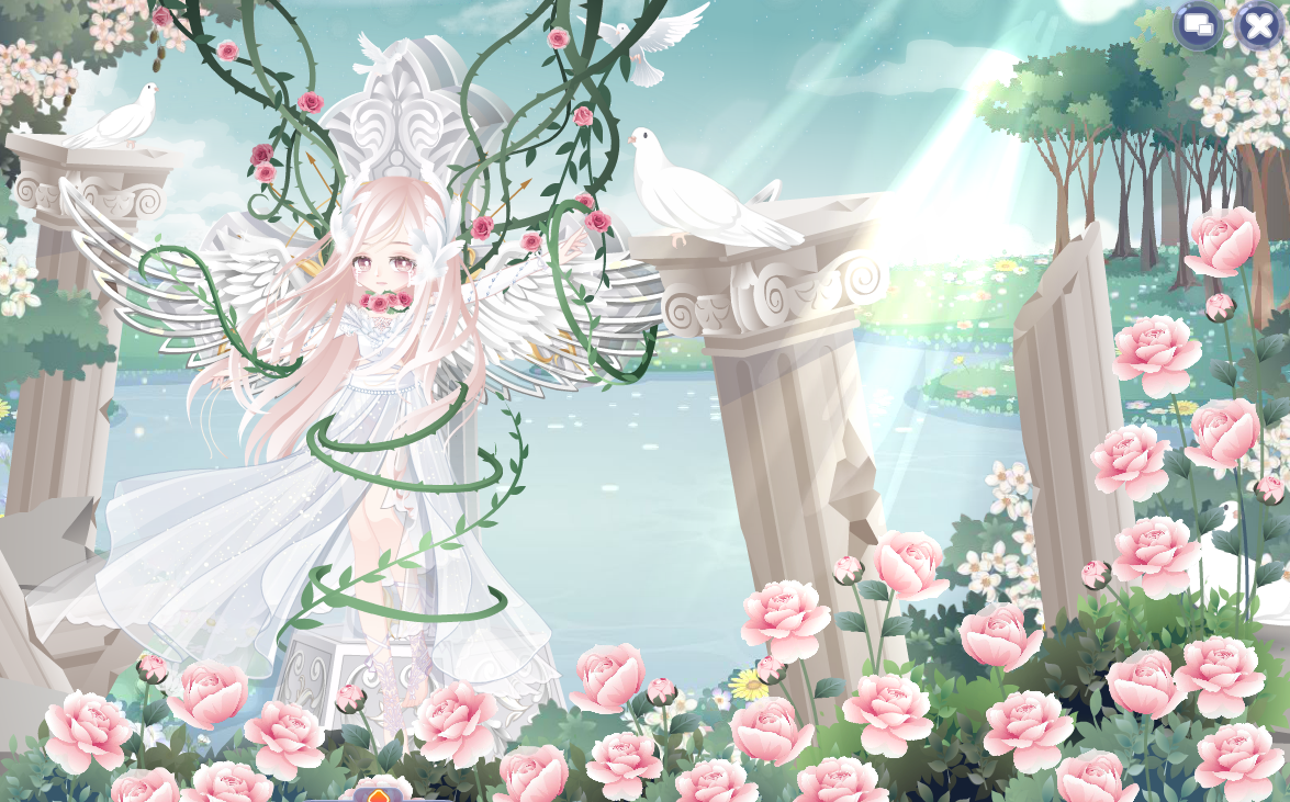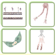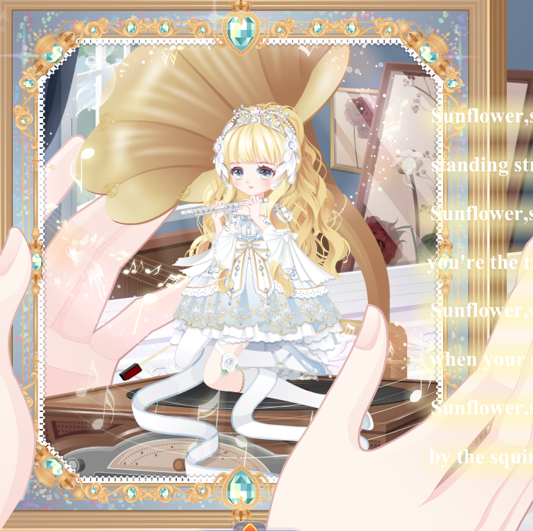 搭配部件:圣之诗双马尾,春风泡沫连衣裙,双子探险鞋子,漫游梦境惊讶颜,花溪梦音花发型带,温柔校花比心,时空旅人怀表,欧式清新花房,艾琳初恋信纸框
