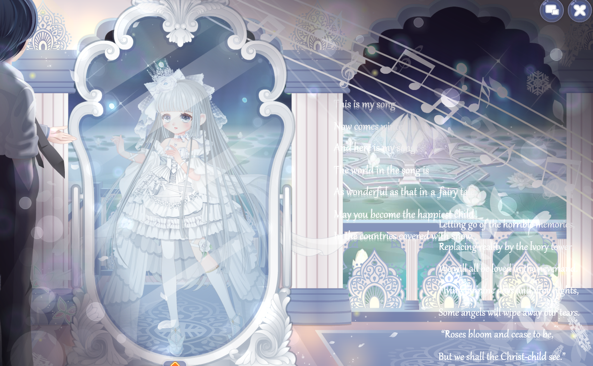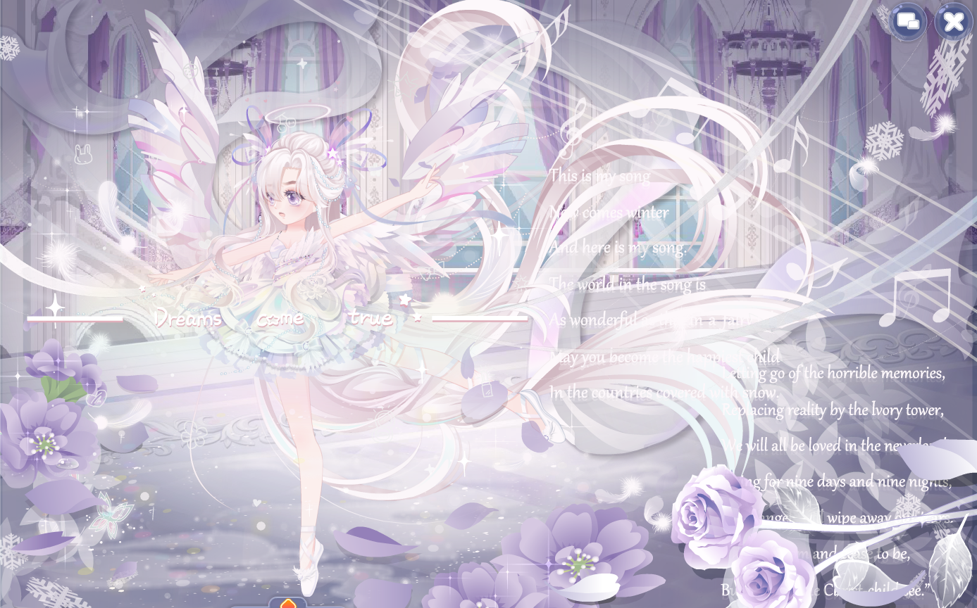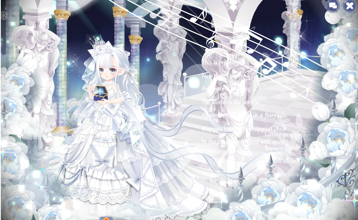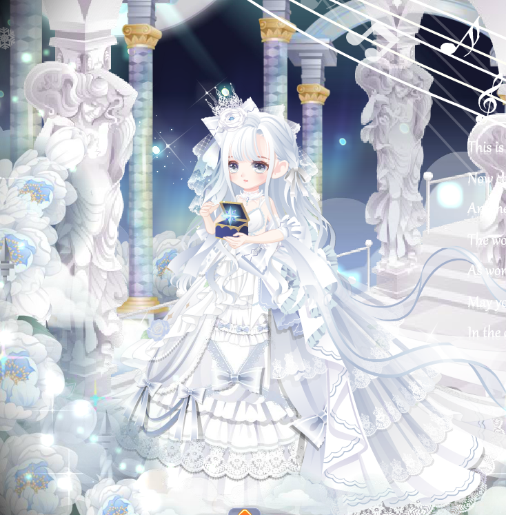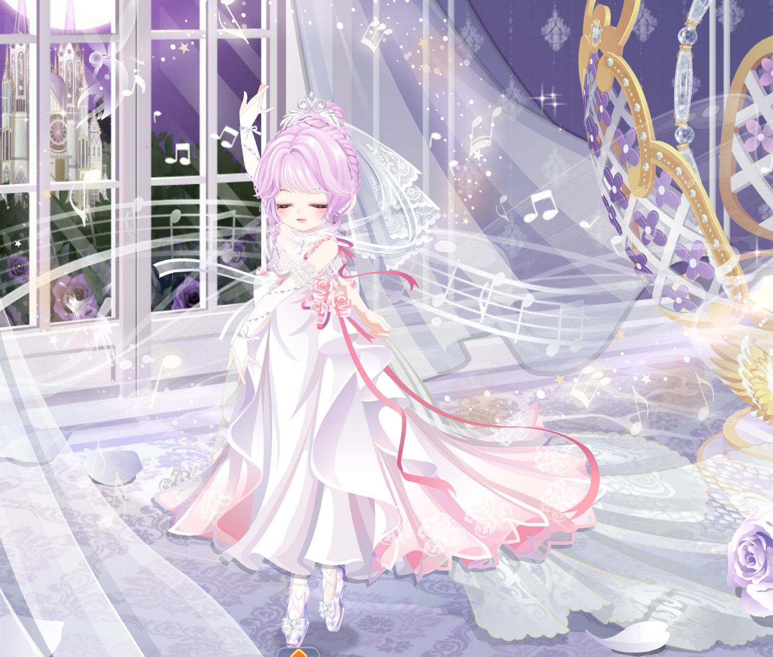 搭配部件:芭蕾公主折纱,芭蕾公主拖纱,芭蕾公主舞纱,芭蕾公主琉璃姿,芭蕾公主琉璃右袖,时空旅人羽翼,铃霜白鹿裙,幽紫曼纱白衬裙,幽紫曼纱白上衣,月·不思难忘,美神诞生盘发型,花溪梦音拖纱,秀丽南珠项链,暗夜新娘头纱,蜕变星蝴蝶饰,铃霜雪鹿背景,月时消砂弥漫,囚塔公主光效