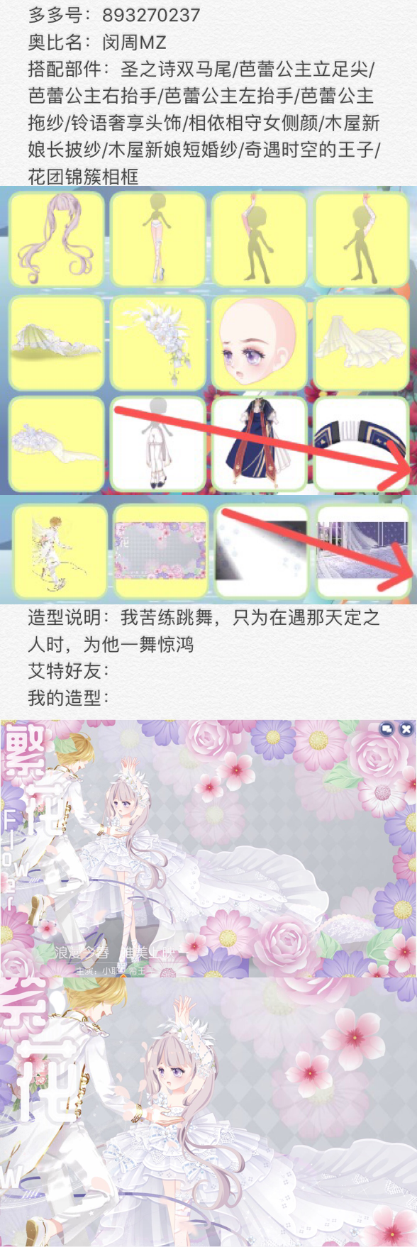 搭配部件:芭蕾公主折纱,芭蕾公主舞纱,芭蕾公主追赶姿,时空旅人项链,铃霜白鹿裙,幽紫曼纱白上衣,幽紫曼纱左袖,罗幕轻寒,软甜梦境星云妆,花忆少女右袖,白月光璀璨步摇,幻灵独角兽头饰,彩色祥云瑞兆,星云轻紫背景