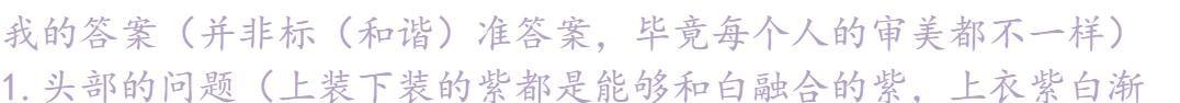 或者换一个头饰,换成不那么突兀的,淡一点的紫。把帽子换了也可以,总之想尽办法不要让头部有突兀的地方。