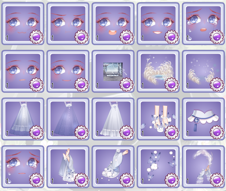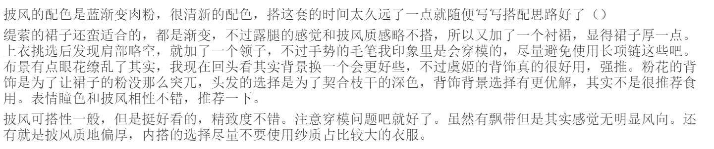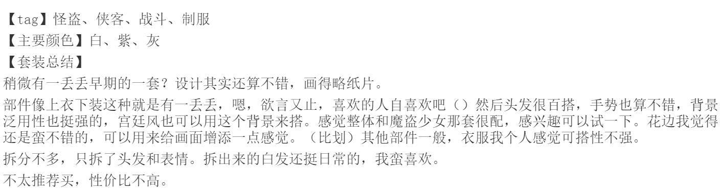 卷轴和花边都不错,感觉是全套画得最用心的。披风也还行吧,放在套装里效果一般但是拉出来单配不算难搭,尤其是拆分出来的那几版,放在原套感觉外套和裙子割离了,我不好说()背景画得略水,部件大多质量和版型都中规中矩甚至偏水,不好评价。头发容易显头大,搭配的时候要注意好协调。