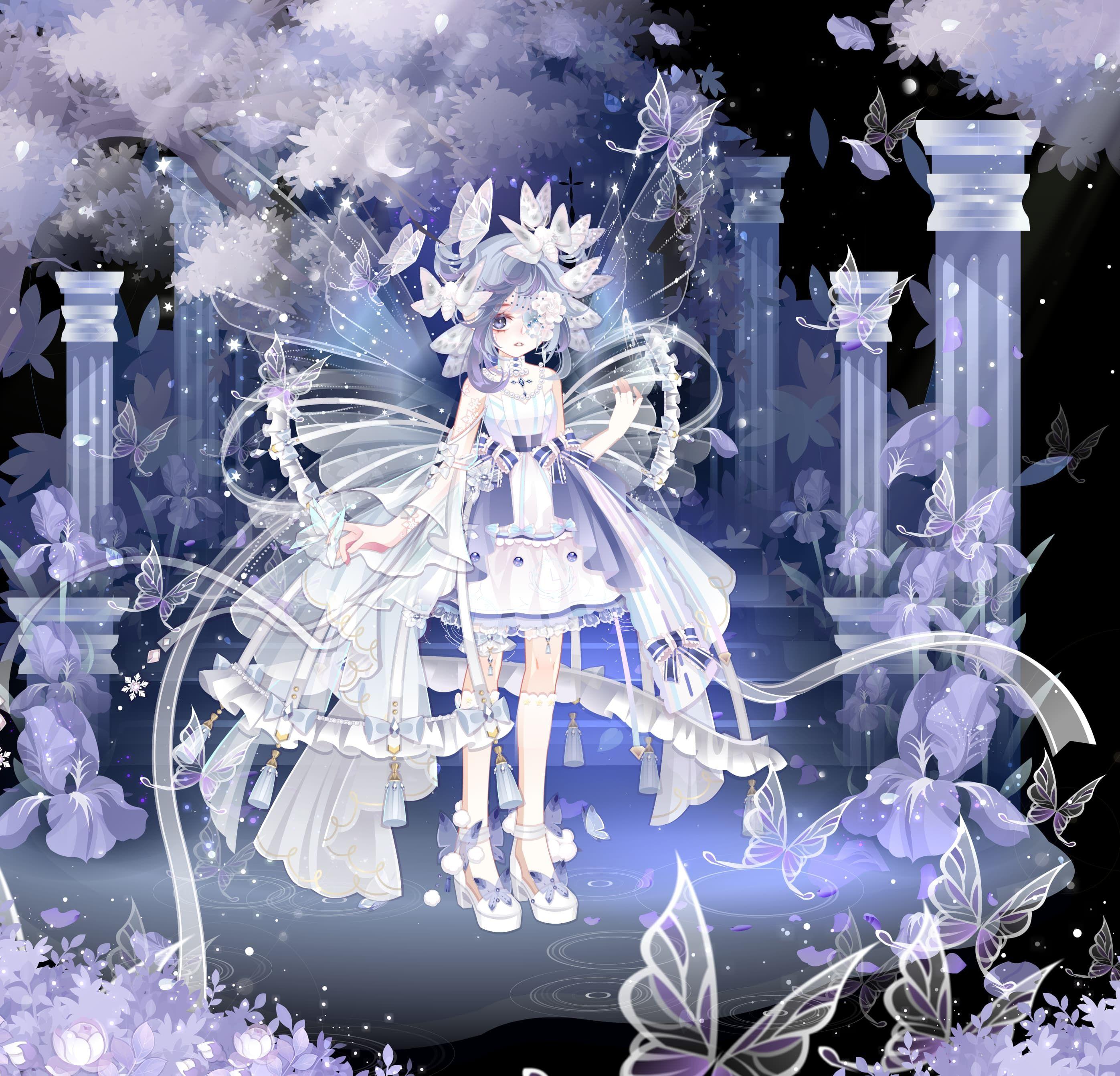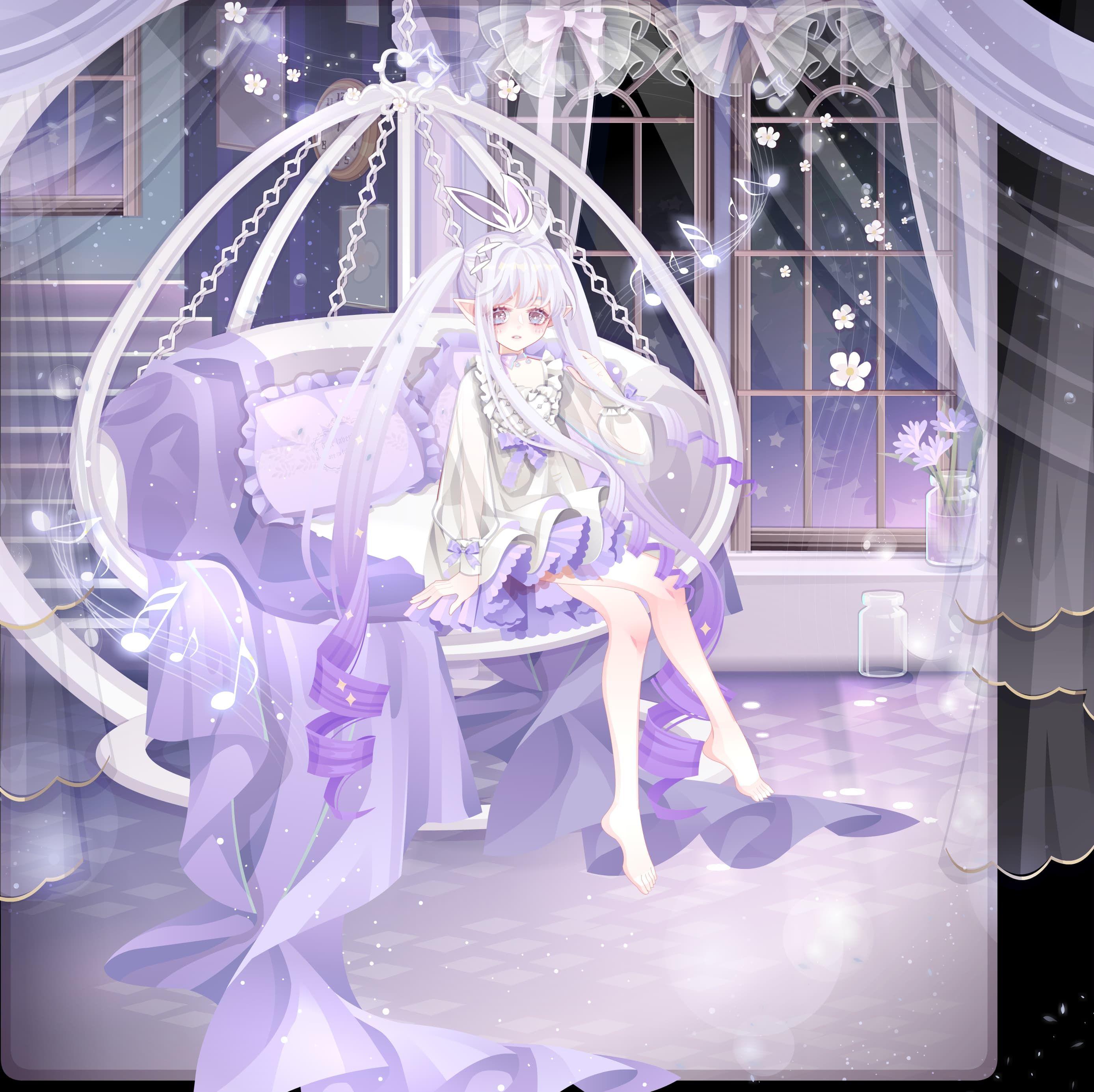头发是由白渐变到紫,所以以紫色为基础搭了整套。先挑了黄水晶的紫裙,因为当时衣柜翻到这个就用了(这就可以看出我这张搭屯了多久(目移 然后选了紫苑的吊椅,和裙子配置挺好的,推荐一下。用了一个能坐上去的坐姿。然后头发尾部是有一些金色的小星星的,所以在背景卡和小配饰的挑选上都遵从了紫色为主金色为辅的颜色搭配。表情随便选的()金瞳或许会好一些。总的来说就是很水啊啊啊啊现在一看画面好空()希望大家丰富画面的时候引以为戒()
