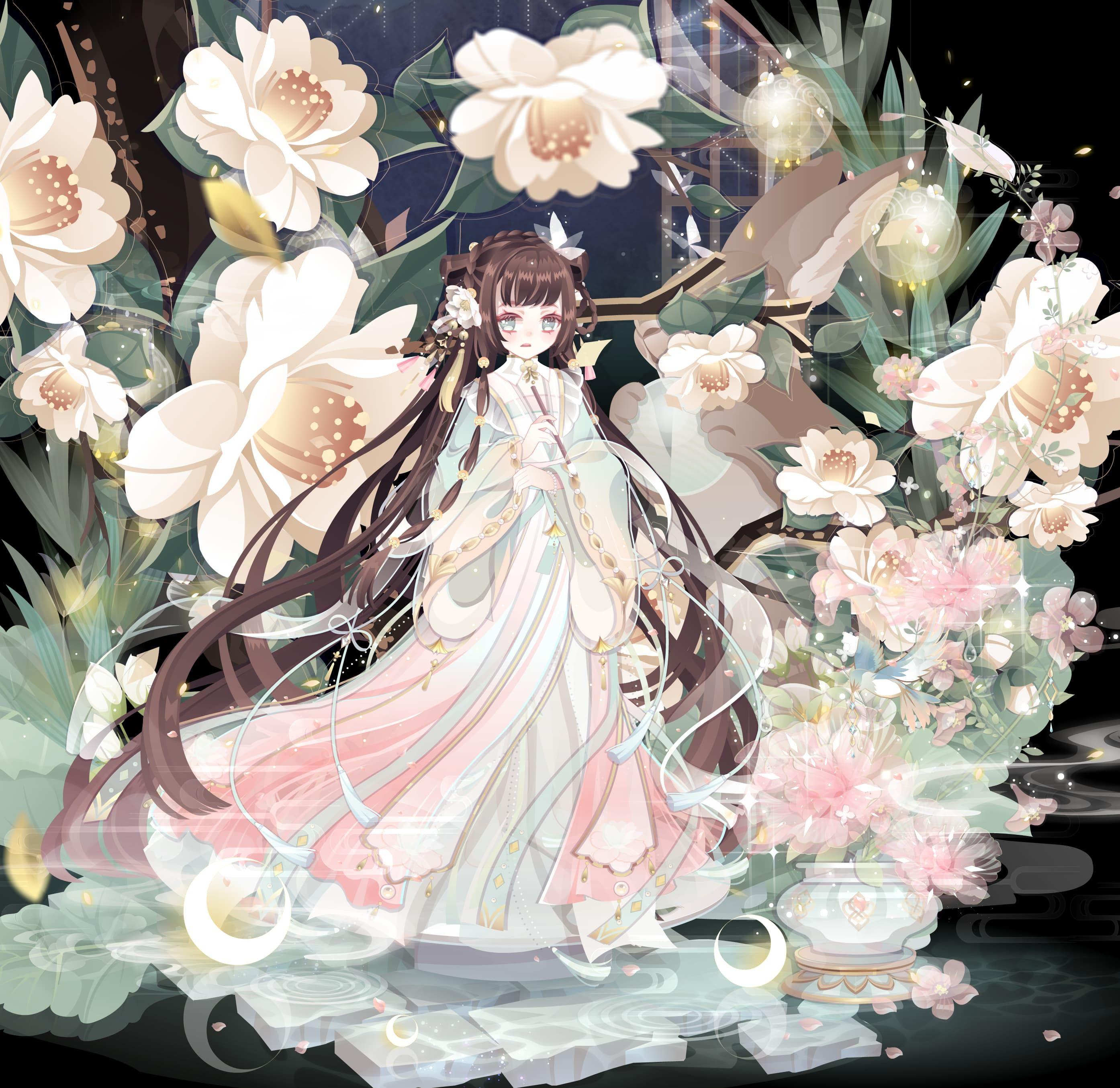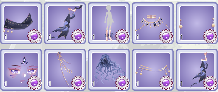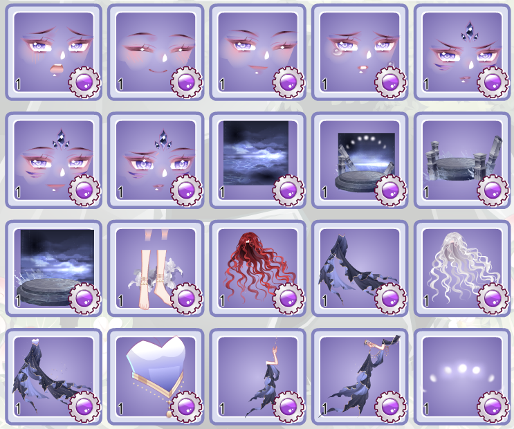 部件其实都还不错,我个人会比较喜欢裙子和手袖这种飘纱的设计,看起来有点像飞扬的鱼尾,并不是很规整的褶皱也是一大出彩的点,可以说在秘宝套里是看见就会眼前一亮的程度。背景画得也还不错。饰品等相对来说中规中矩,腰链还行。