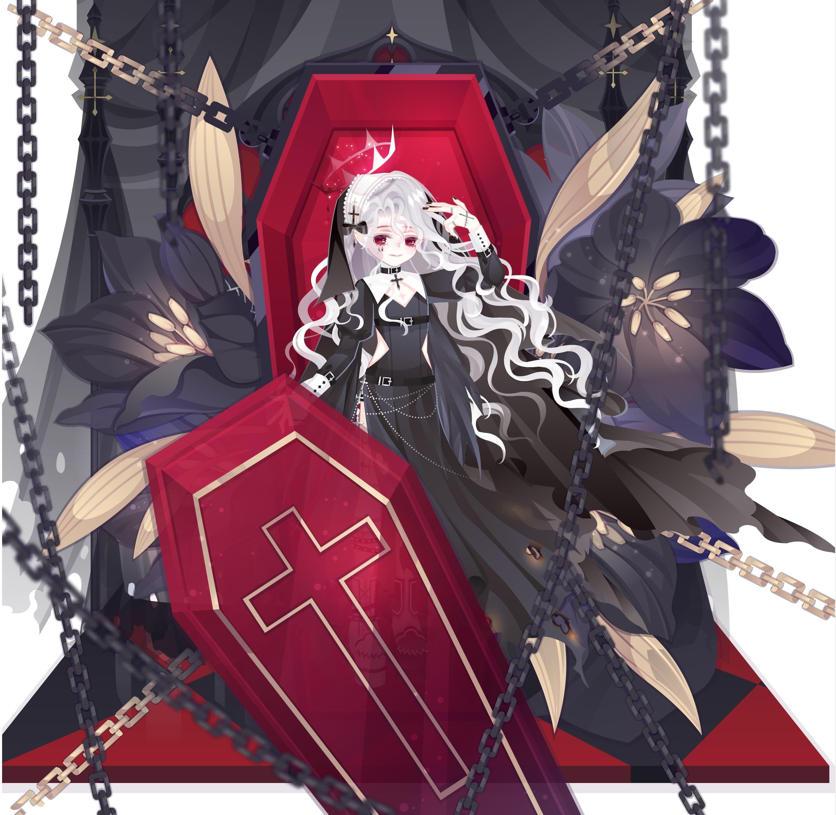 红瞳、修女服、修女帽根据曲绘来的,总之就是很爽的一个搭。鞋子其实略有色差,但是配上裙子很有感觉。头纱色差也蛮严重的就是,救不回来了遂放弃。光环是根据歌来选的,棺材的设计我觉得不错就用了,和背景的组合还不错,傀儡的锁链刚好能和棺上的锁链对应一下,效果还蛮好的。总之就是看到这条裙子脑子里已经开始嘟嘟噜嘟嘟嘟噜風了()头发在这里作了一个分隔颜色的作用,效果类似于黑白格子?风向恰好对上,穿模问题也不是很大。不过这套搭的色差问题我自裁。