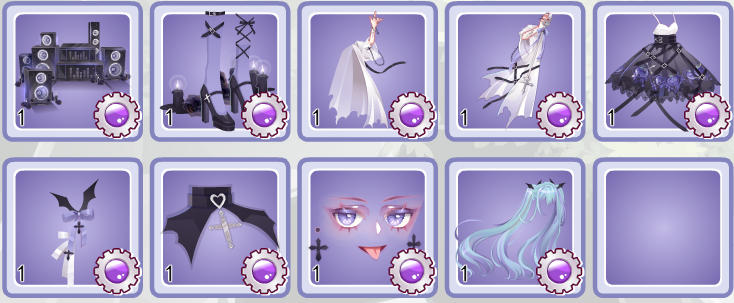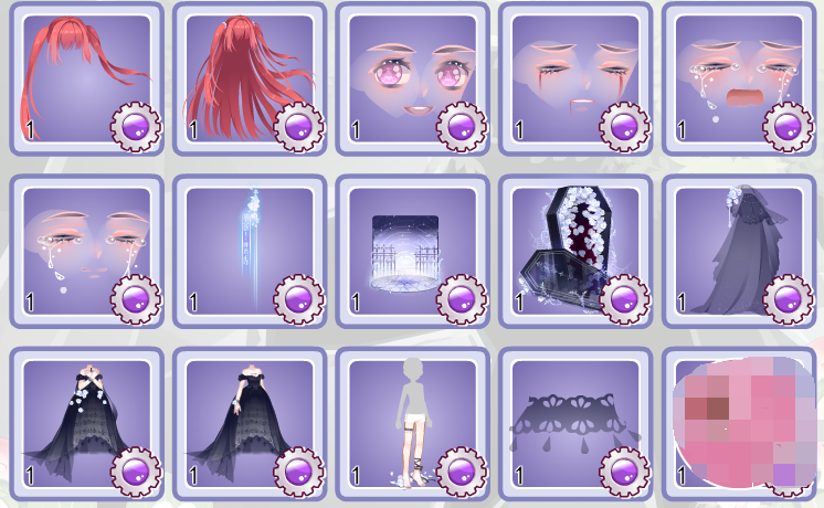 我个人最喜欢的还是背饰,印象里这是第一个把人塞进棺里的背饰,半透明的盖不会挡住裙子和腿部的细节,棺里满溢的花也是一大亮点。裙子的版型非常不错,自带手势,免去了找手部配饰的麻烦。比较可惜的是整套的黑都算奥雅里少见的,搭的时候色差略殇。。