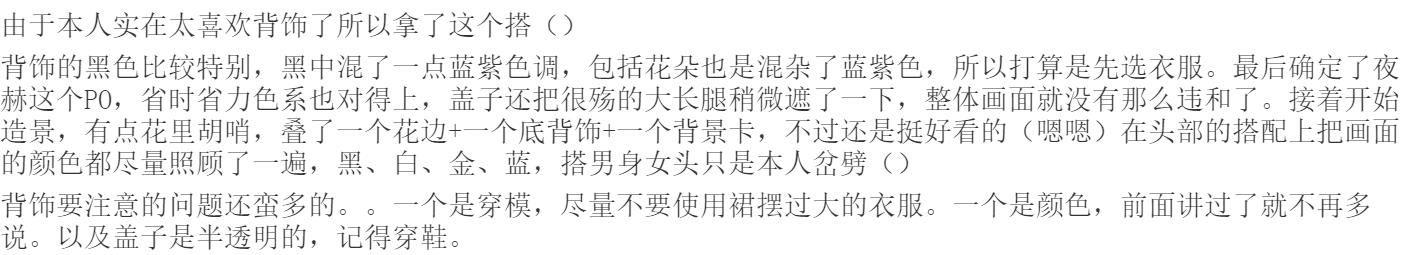 头饰很适合万圣节搭()虽然质量看起来像花朝小铺()主要安利一下头+头饰+PO的配置吧。花边是找不到合适的南瓜了就用了原套,然后还加了一个占空间较大的1背饰,再补了个同主题的背景卡就搭完了,很水很爽效果我个人也觉得不算太差()