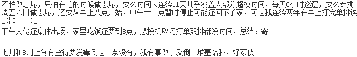 今天llq的弗拉仕插件又崩了,更不想登了,思考一没能聊的好友二没强烈的遇望三没钱的,为什么会想继续玩奥雅,因为不玩会更无聊吗?