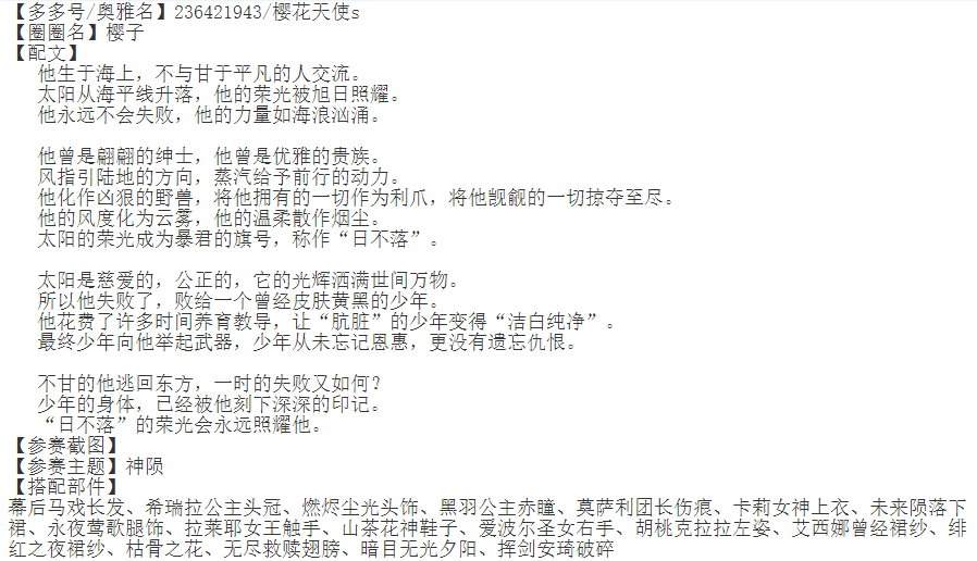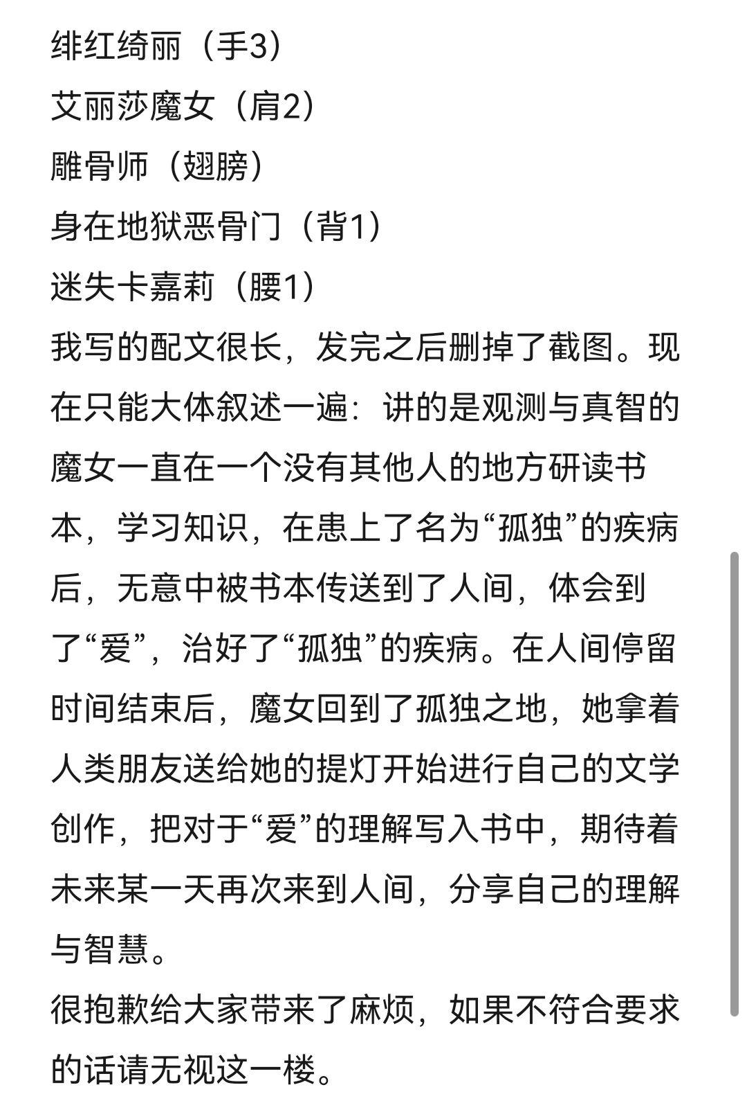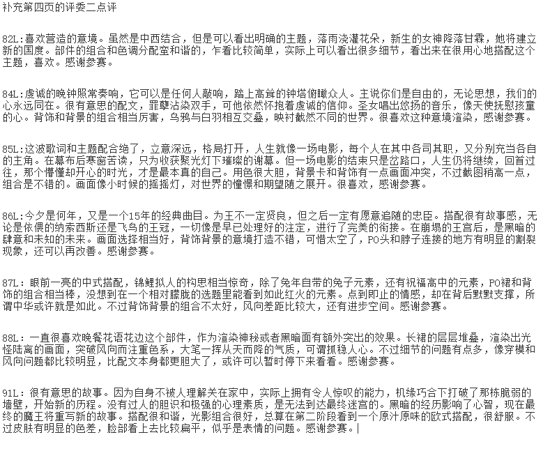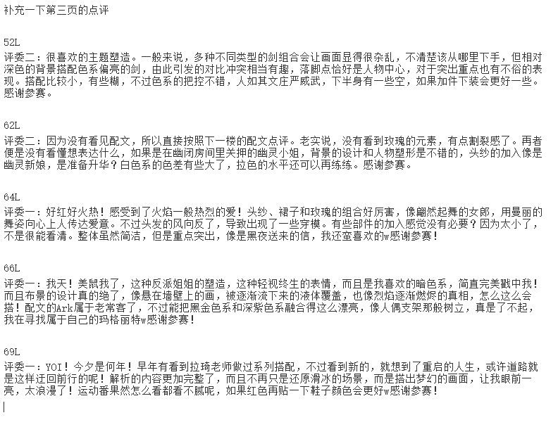 评委一:天哪,这个造景绝绝子!背景、背饰和手的组合太合适了,像是完全相连的一体,超高的搭配之力!故事延续了神殒主题,将双面视角的描写勾勒得淋漓尽致,实在是太厉害!美中不足是有点头重脚轻了,下半身无法支撑头部两个饰品的压力,下半身组合比较简单,而且玫红色拉起来感觉怪怪的w感谢参赛!