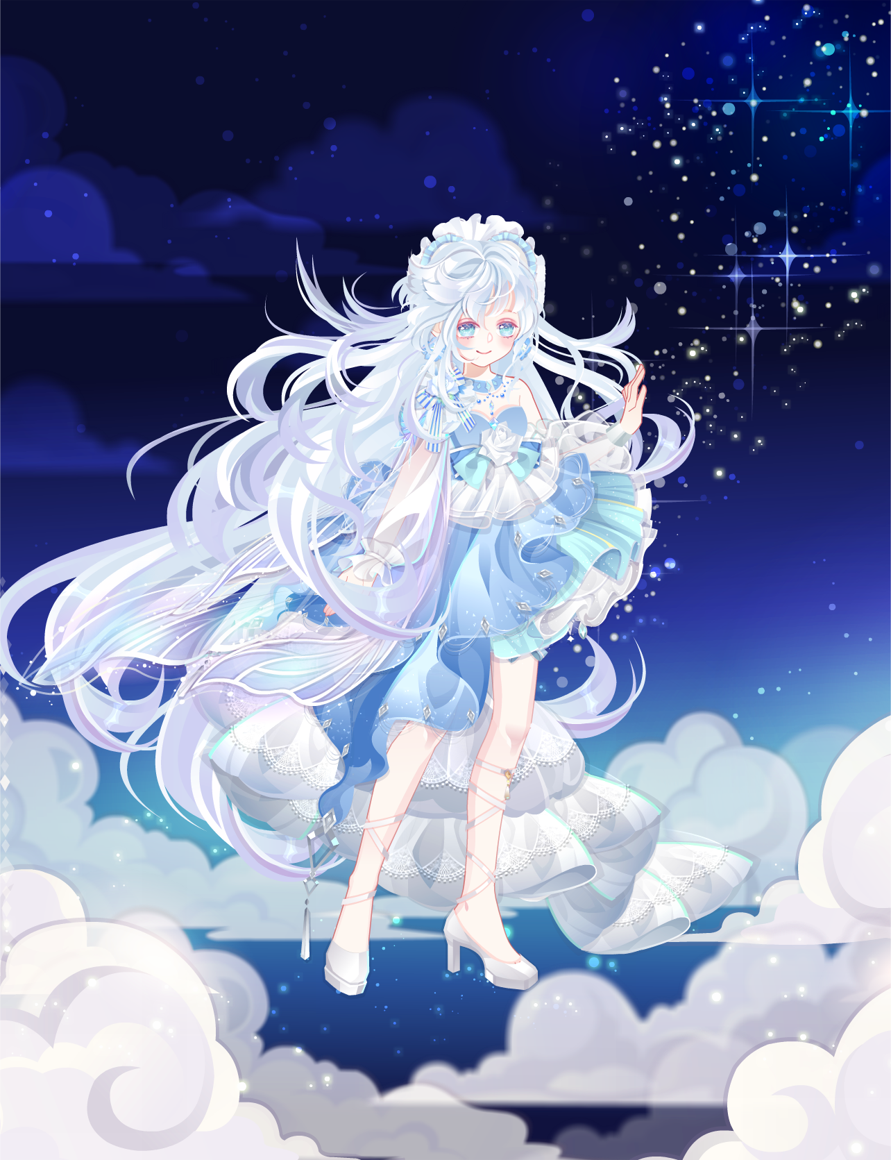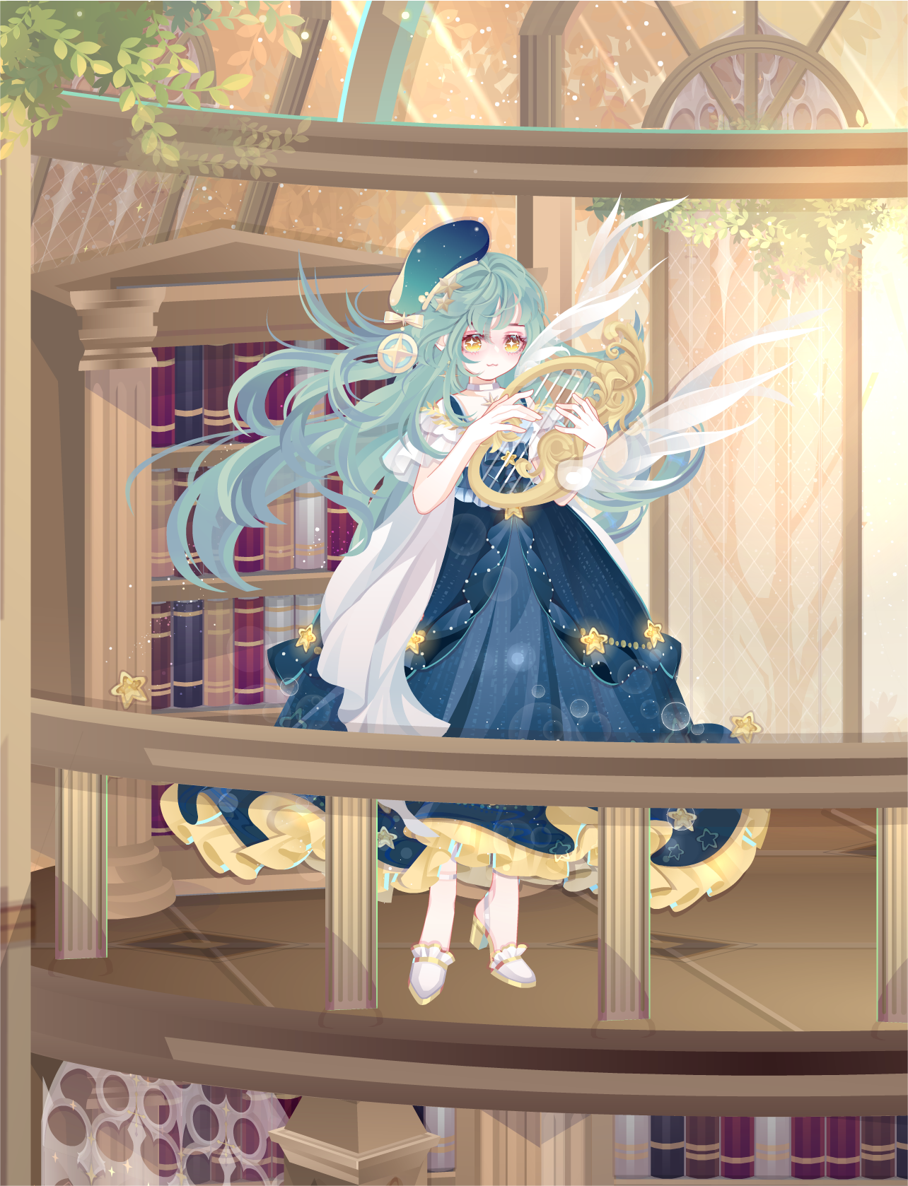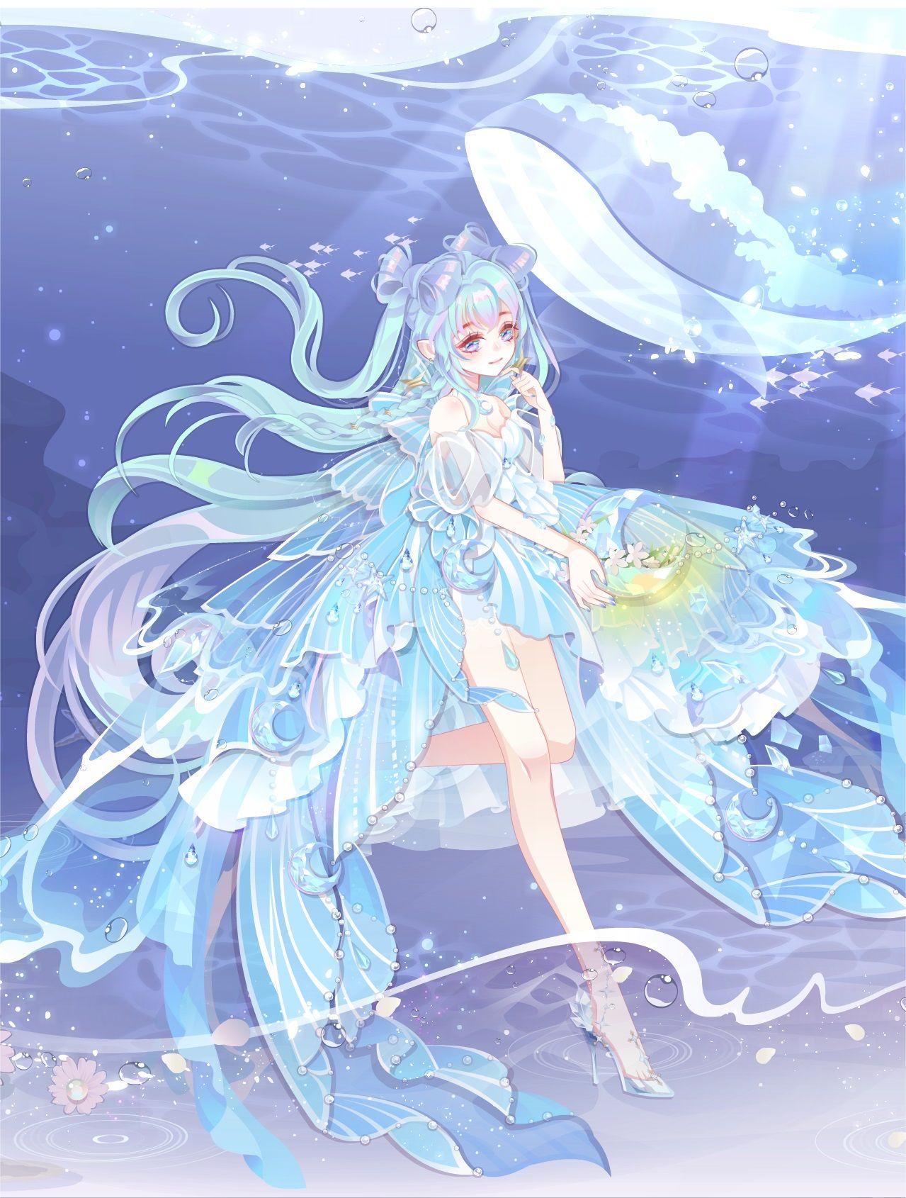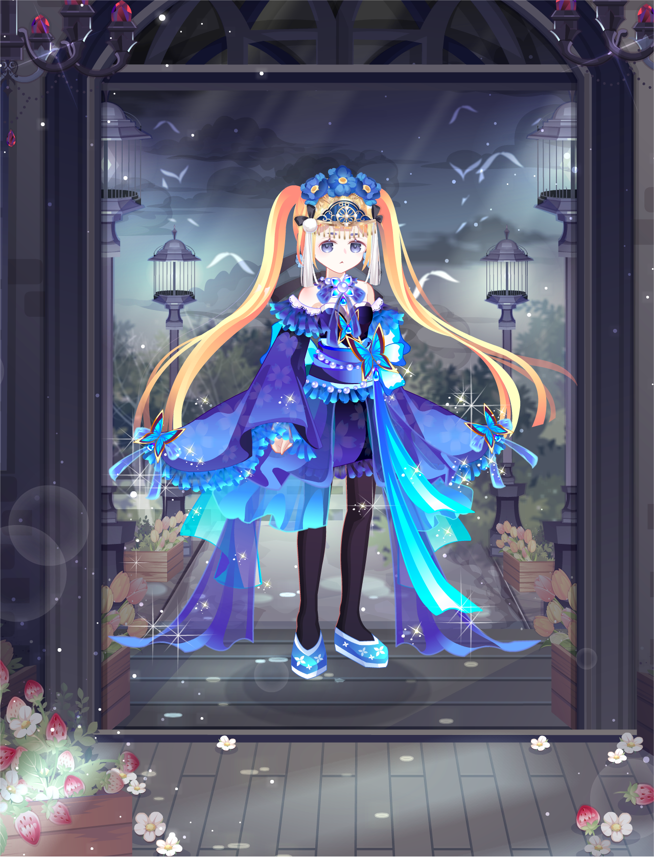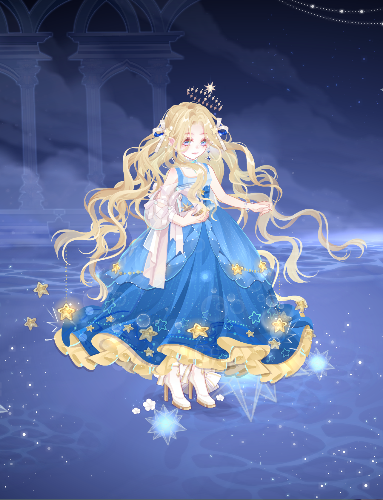 拿到月费后搭的第一幅,从第一条裙子开始。裙子上蓝和金的存在感都很强但主体是蓝比较多,所以与它相接的头发、鞋子都用了金色,然后在其中加蓝色点缀。