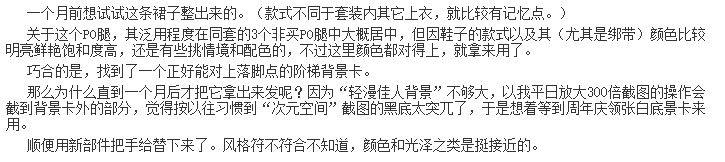 如果把右手换成随便哪个遮不住上身的,可能就会觉得这个上衣和下裙接得没有那么好……但它依然是我能凑得出的接得最好的非原套组合,所以想以这种形式留下来。至于引入的金色,有其他地方呼应就可以了。
