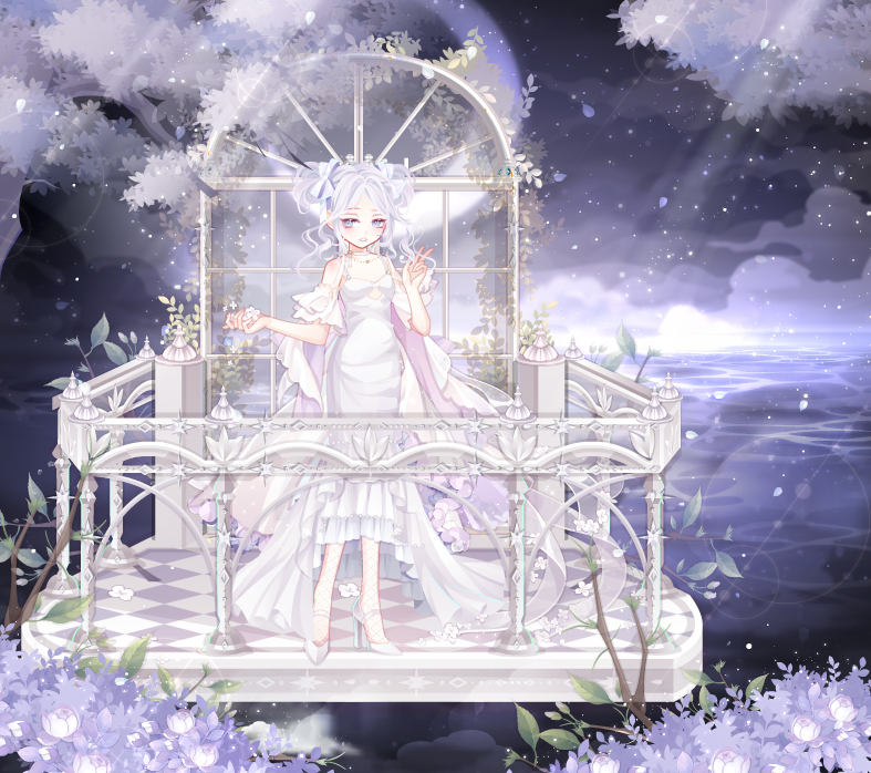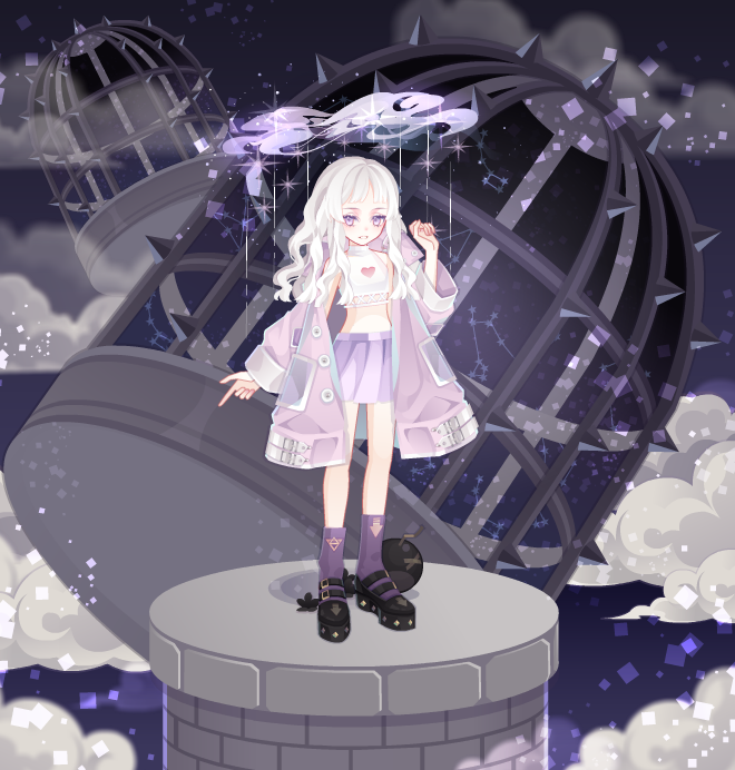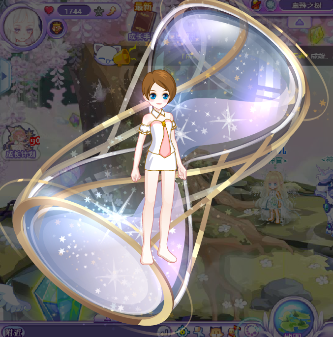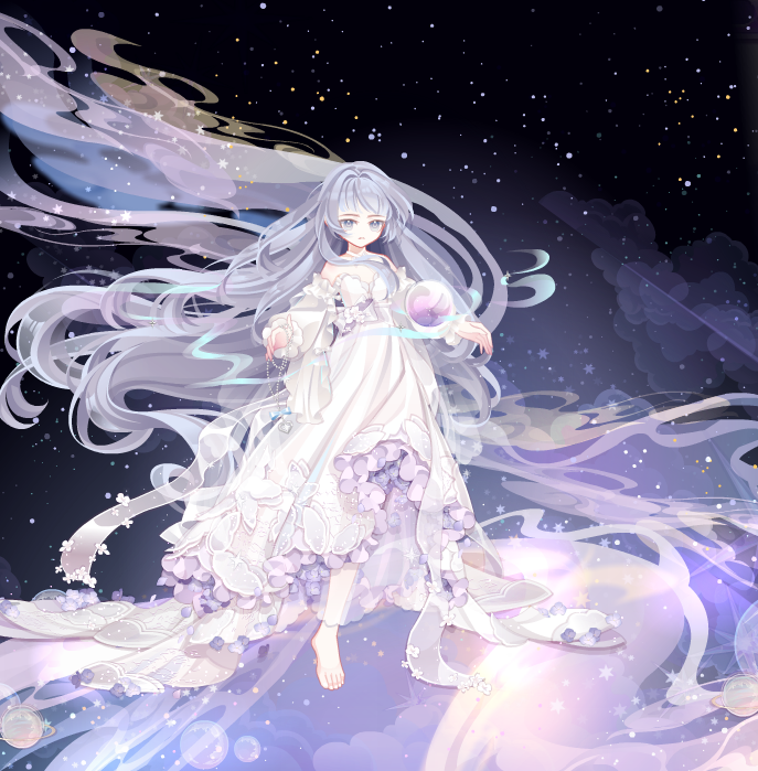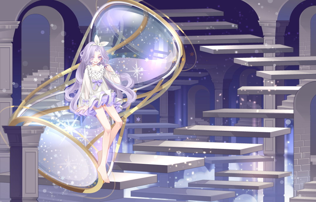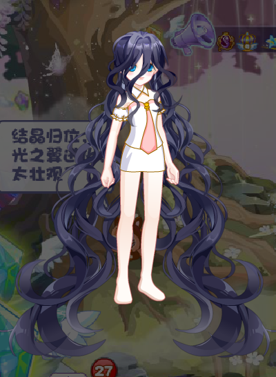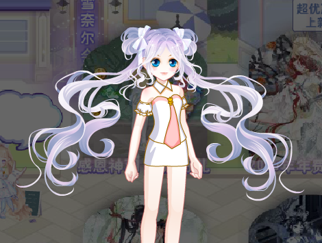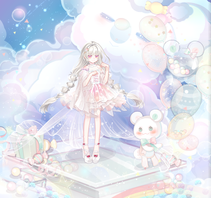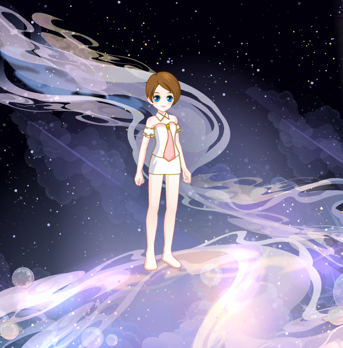 年费的幻动头发,有飘动和变色的效果,是由白发转变成深色,整体头发很漂亮,幻动效果也还不错,星空的颜色配上闪烁的星点,白色蝴蝶结搭配着包子头双马尾,很可爱,和很多梦幻风格都很适配