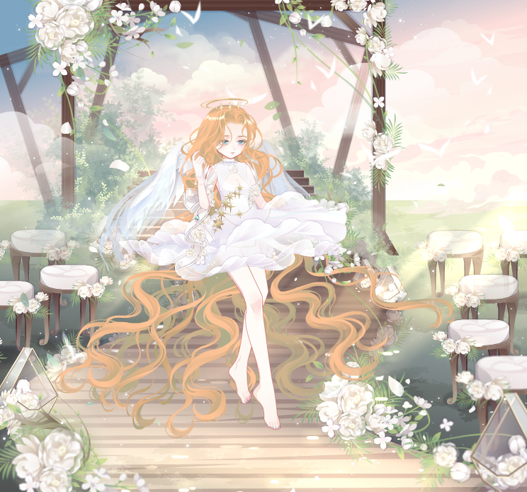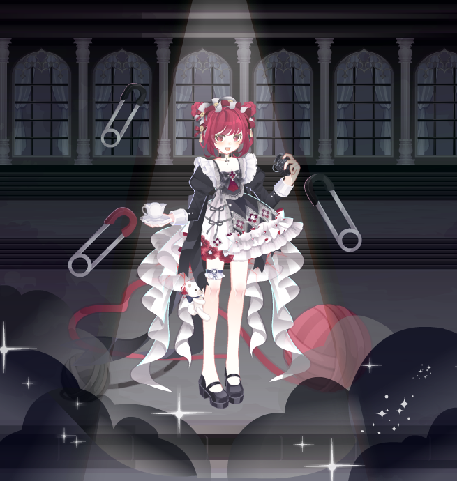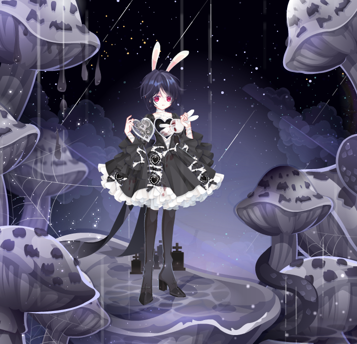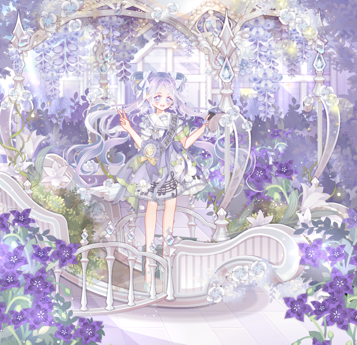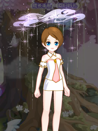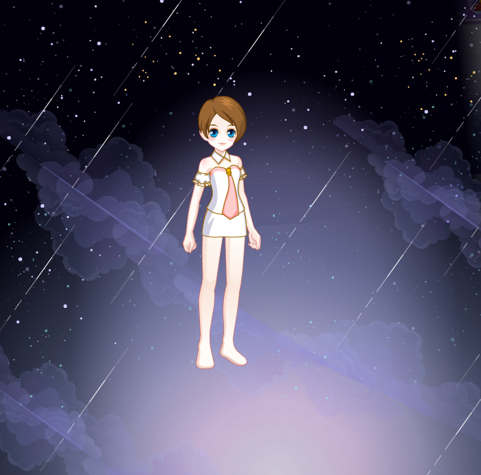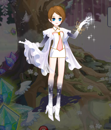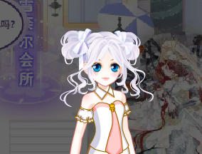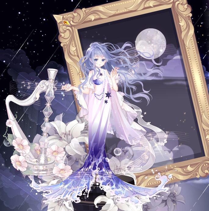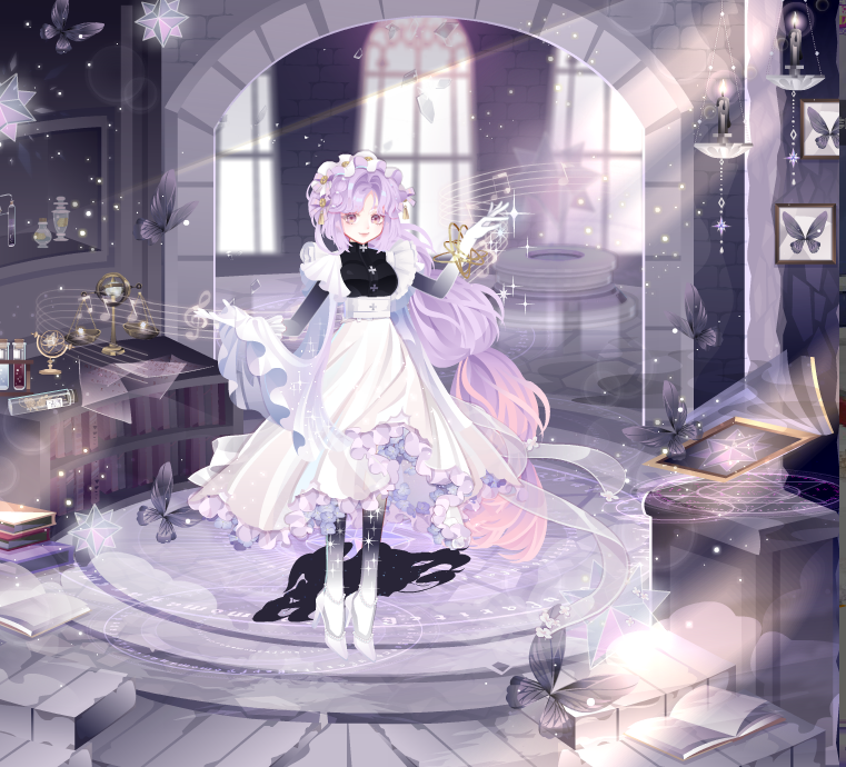 年费的幻动头发,有飘动和变色的效果,是由白发转变成深色,整体头发很漂亮,幻动效果也还不错,星空的颜色配上闪烁的星点,白色蝴蝶结搭配着包子头双马尾,很可爱,和很多梦幻风格都很适配