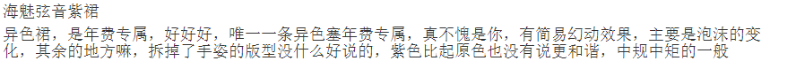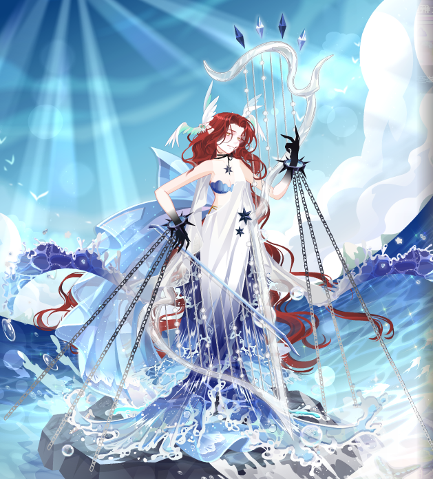 终于到四月神羽了,是海妖的琴的主题,主体元素水,乐器和妖怪,从主裙上都可以看出来,长裙起到了很好的修饰比例的问题,不需要po腿就可以拉长人模的好选择,而且也不用愁用什么鞋子合适,不过搭配限制很大,不符合主题的部件很难融入进去