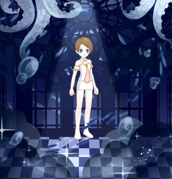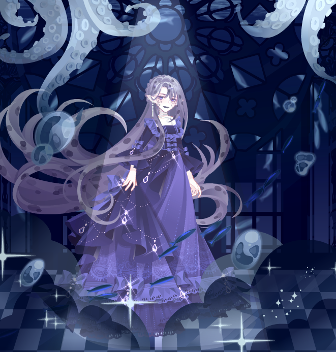 年费的幻动背景,主要效果是触手挥动加上迷雾飘动,总体并不突兀,深色系背景偏蓝,游鱼触手等海洋元素加上巨大的玻璃花窗和顶上打下来的灯光,像是在深海中的教堂里,今年神羽两个在水中的背景了,确实比较好制造氛围感,个人感觉四月的比一月的水底背景要更好用
