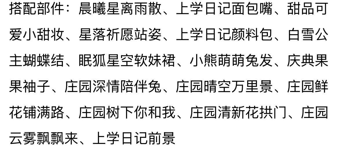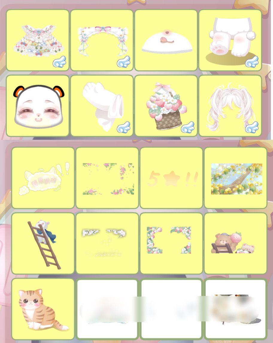 洛蕊旧梦入镜,洛蕊旧梦长发,雪梦邂逅喵喵,雪梦邂逅左袖,未名花田连衣裙,草原牧歌上衣,奇迹珍藏坐姿,光之美少女裙纱,鎏金华夜耳环,鎏金华夜妆,心动豹击外套,x.y春夏蝴蝶巾,庆典歌舞佳丽帽,晴空星圣灵羽纱