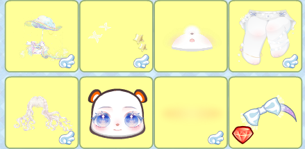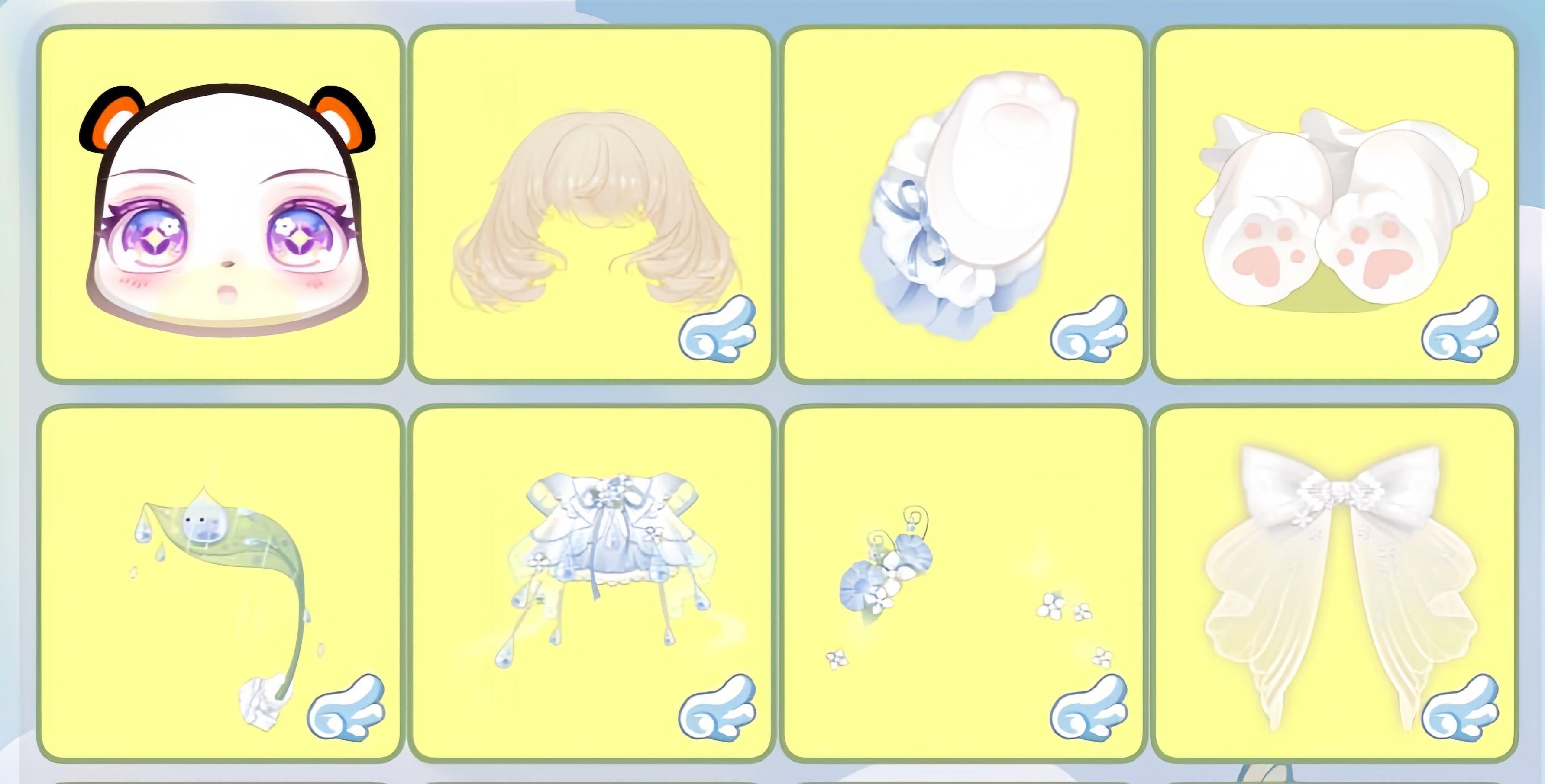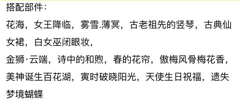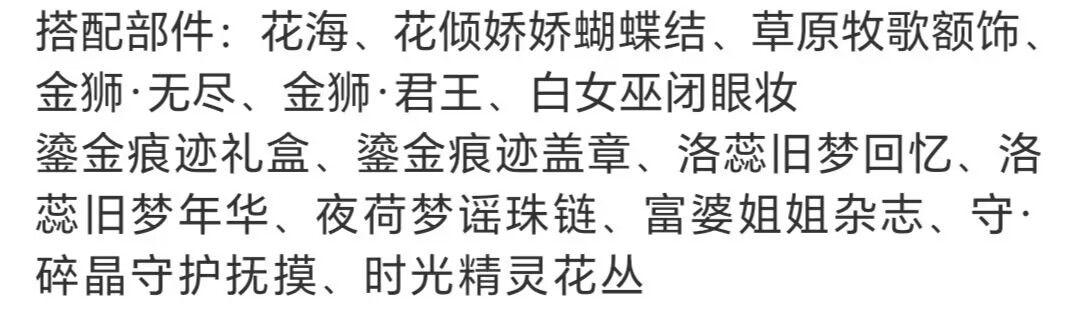 搭配部件:希露恩瞭望妆、菌菇幻想梨花卷、汐盈之花右袖、嗷呜小汪坐姿、阴天挂饰娃娃叶、阴天挂饰娃娃裙、阴天挂饰娃娃饰、时光精灵蝴蝶结、甜梦恋语羽毛、晨光精灵鸟巢、晨光精灵背景、晨光精灵小伙伴、晨光精灵果实、白羊朵朵、白羊幸运