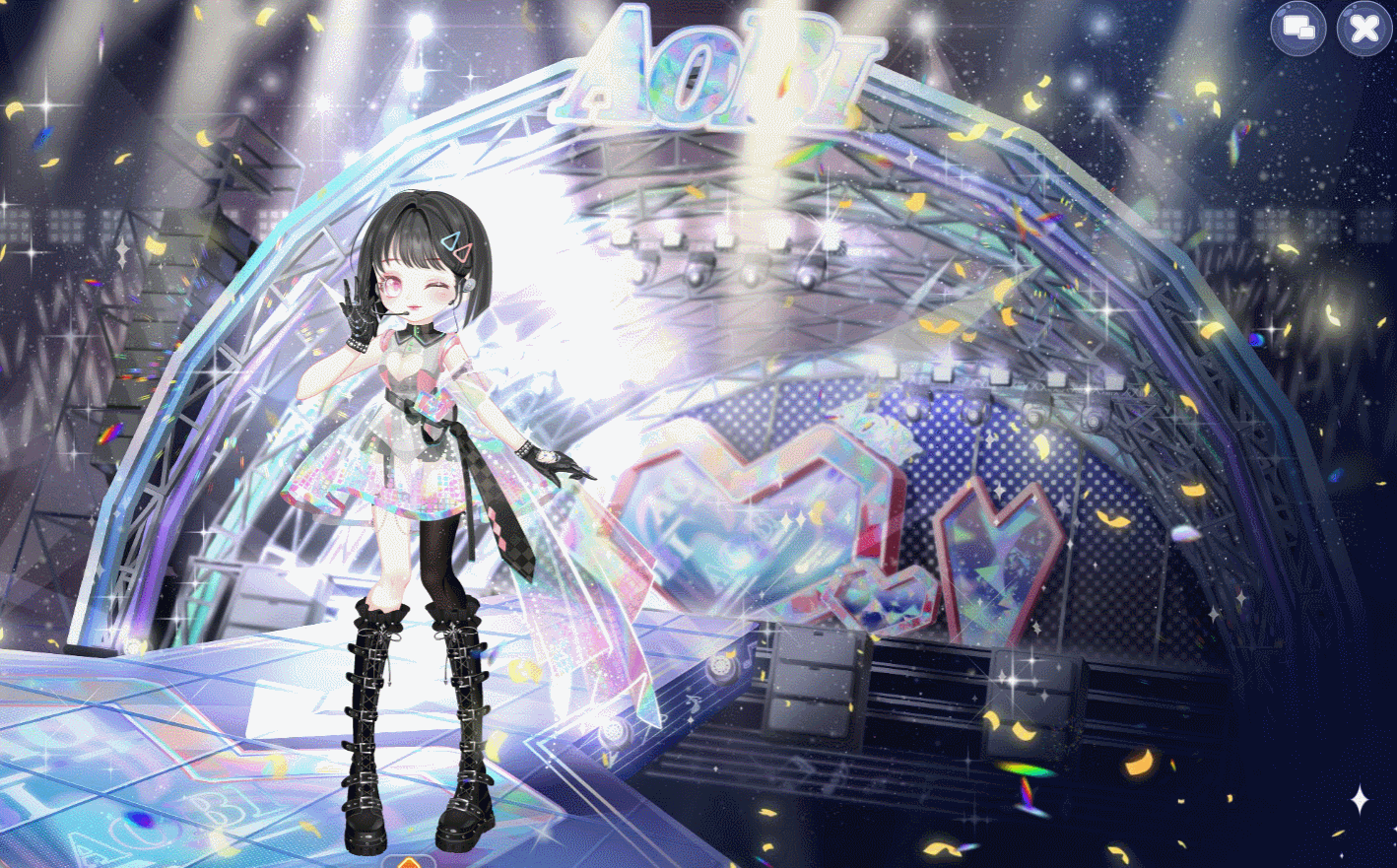 搭配部件:音乐杂志发,青葱时光颜,天国的赠礼,电竞粉猫猫耳机,奶糖甜心站姿,奶糖甜心短裤,奶糖甜心背心,出道夜钻石舞台,出道夜缤纷光,出道夜应援棒,出道夜夺目烟花,星光闪耀舞台,星光闪耀光束,星光闪耀撒花。