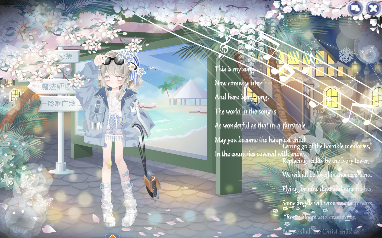 搭配部件:陌·留白,像素晶格星星,花·拨云见日,陈述剧堆堆袜,街拍牛仔蓝外套,夏季清凉网长衫,夏季清新吊带,夏季清新蓝带帽,庆典巡街夜景,羊恋人晚安氛围,大成殿海棠花,旅行路牌,今·寻爱千金花瓣,摩登都市巴士站,雪之歌框架