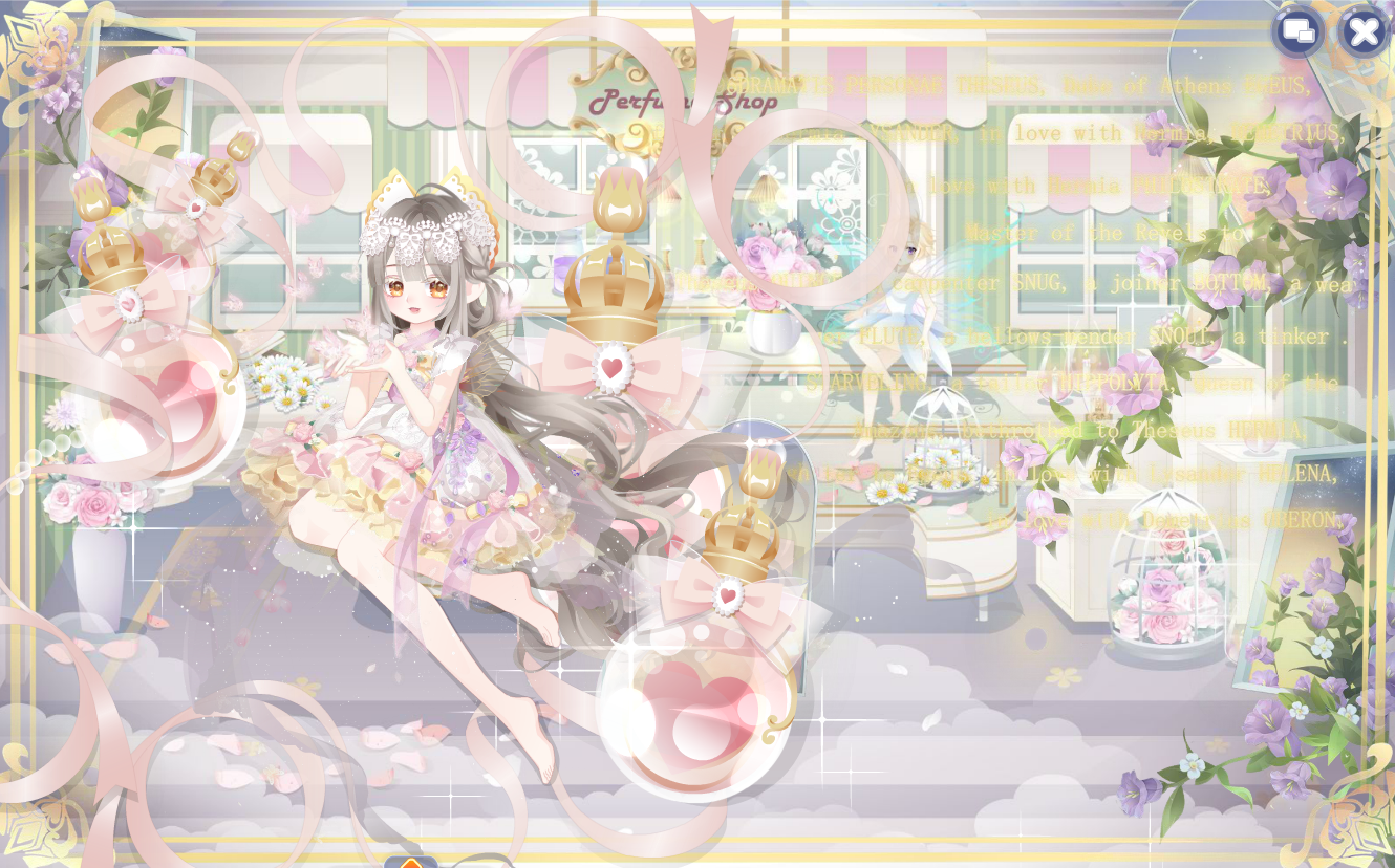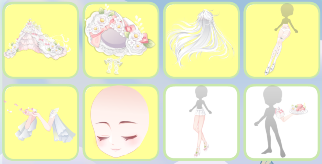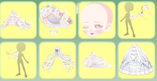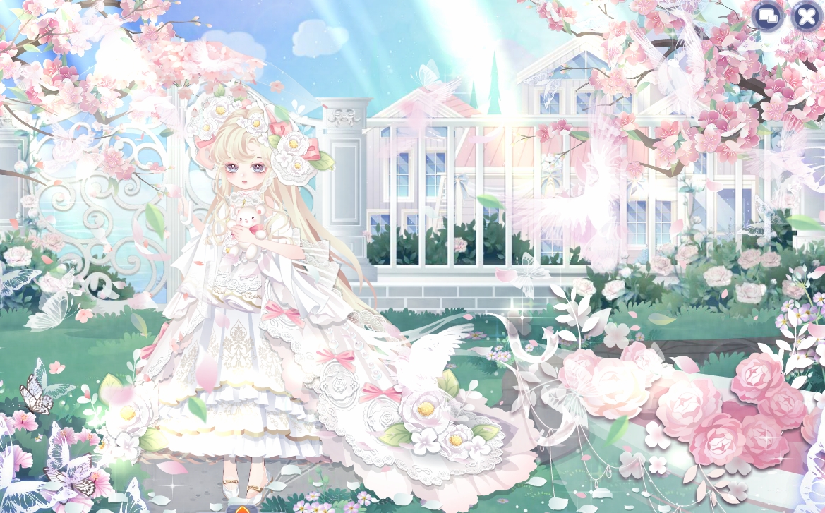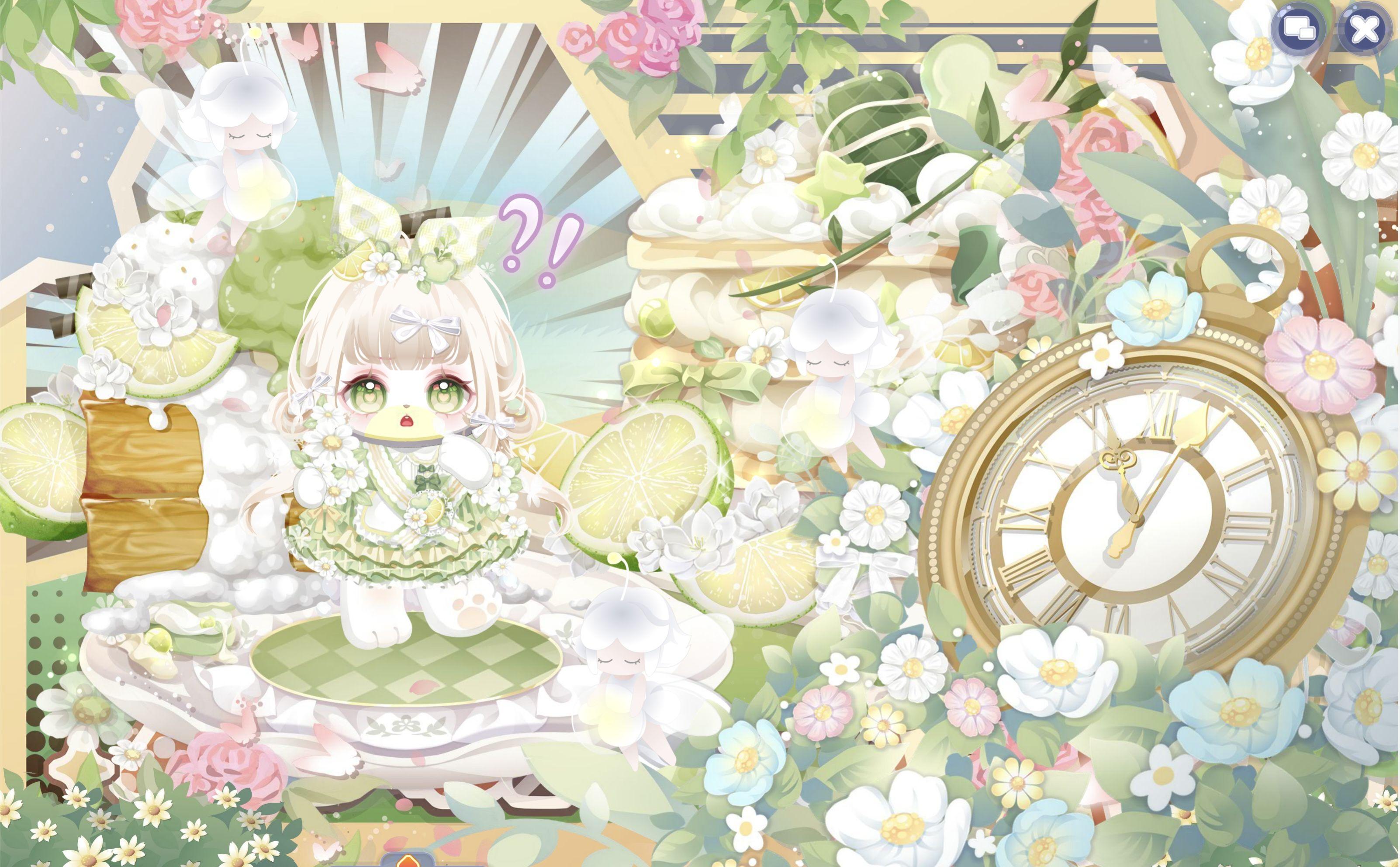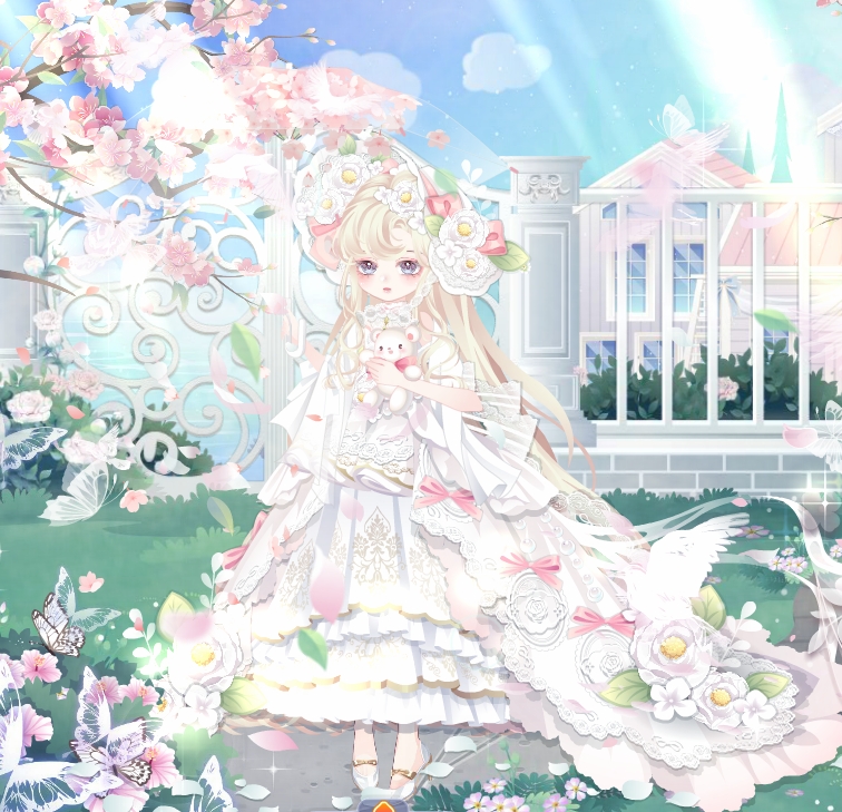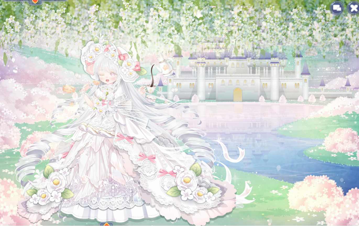 搭配部件:浮花茶话会裙子、浮花茶话会帽子、鱼鱼困倦表情、奶酪甜心左袖、奶酪甜心右袖、琉音浮世发、暖·绽放、幽紫曼纱白长裙、春的花帘、少女梦境光晕、美神油画滤镜、雾香星香薰城堡