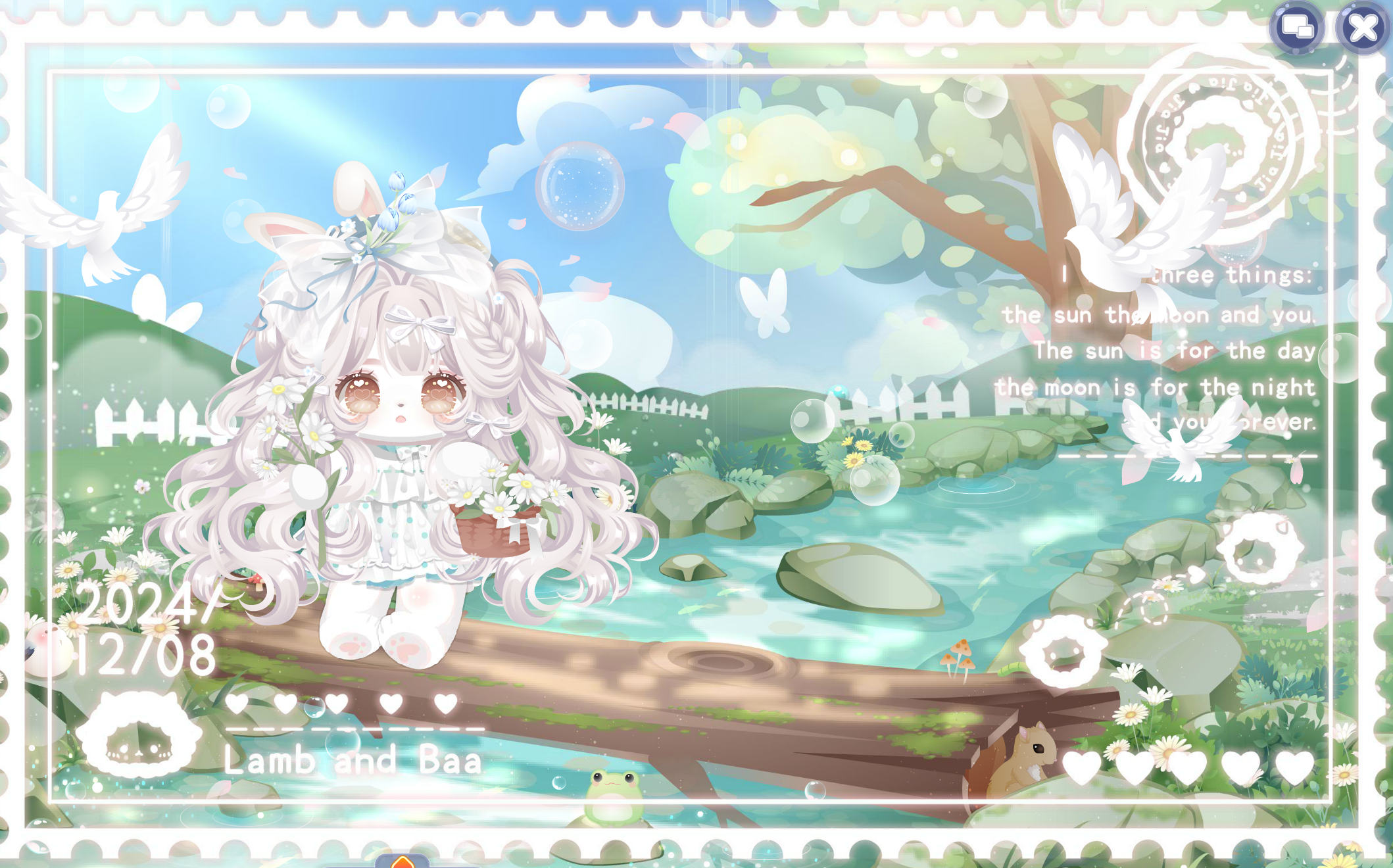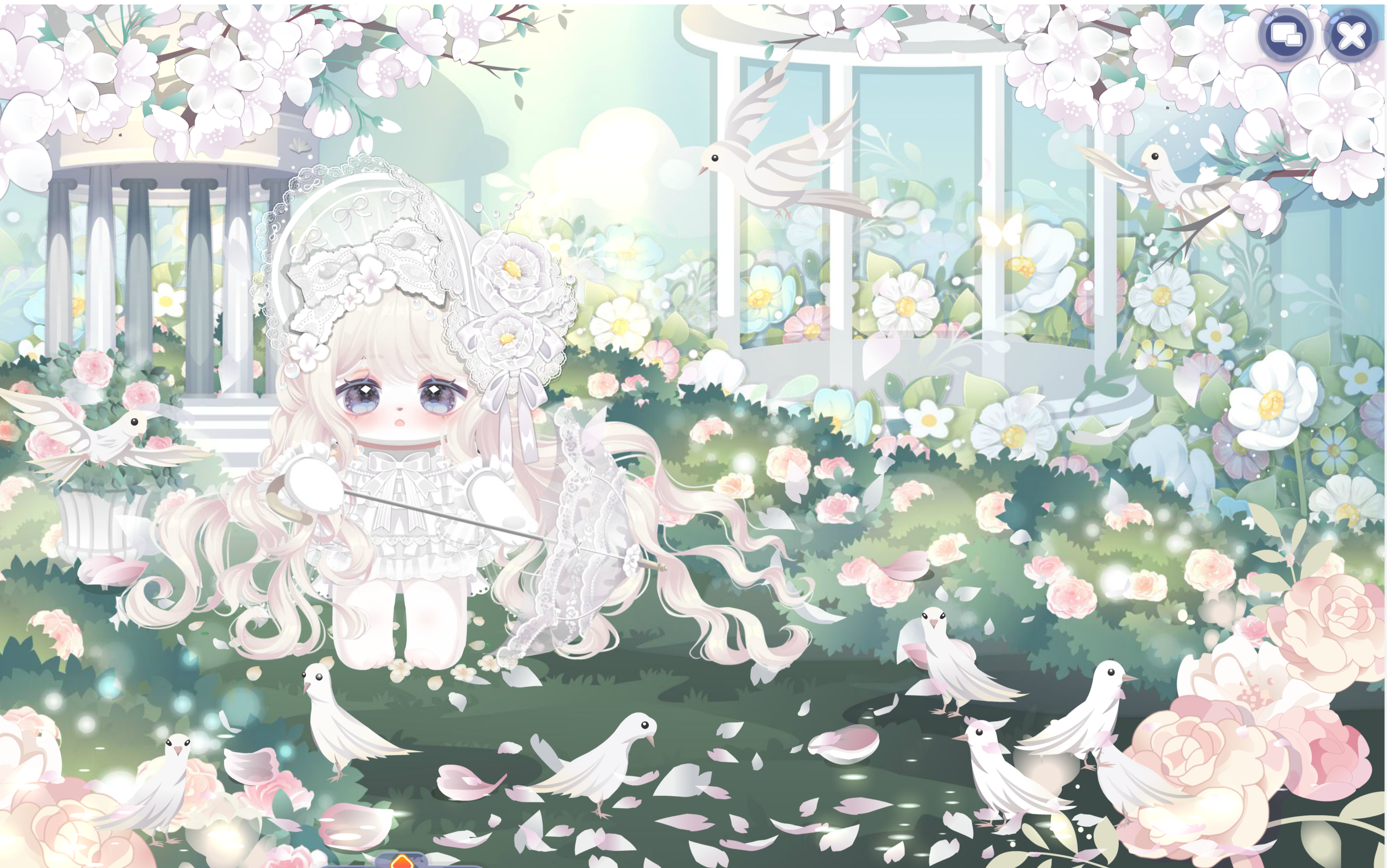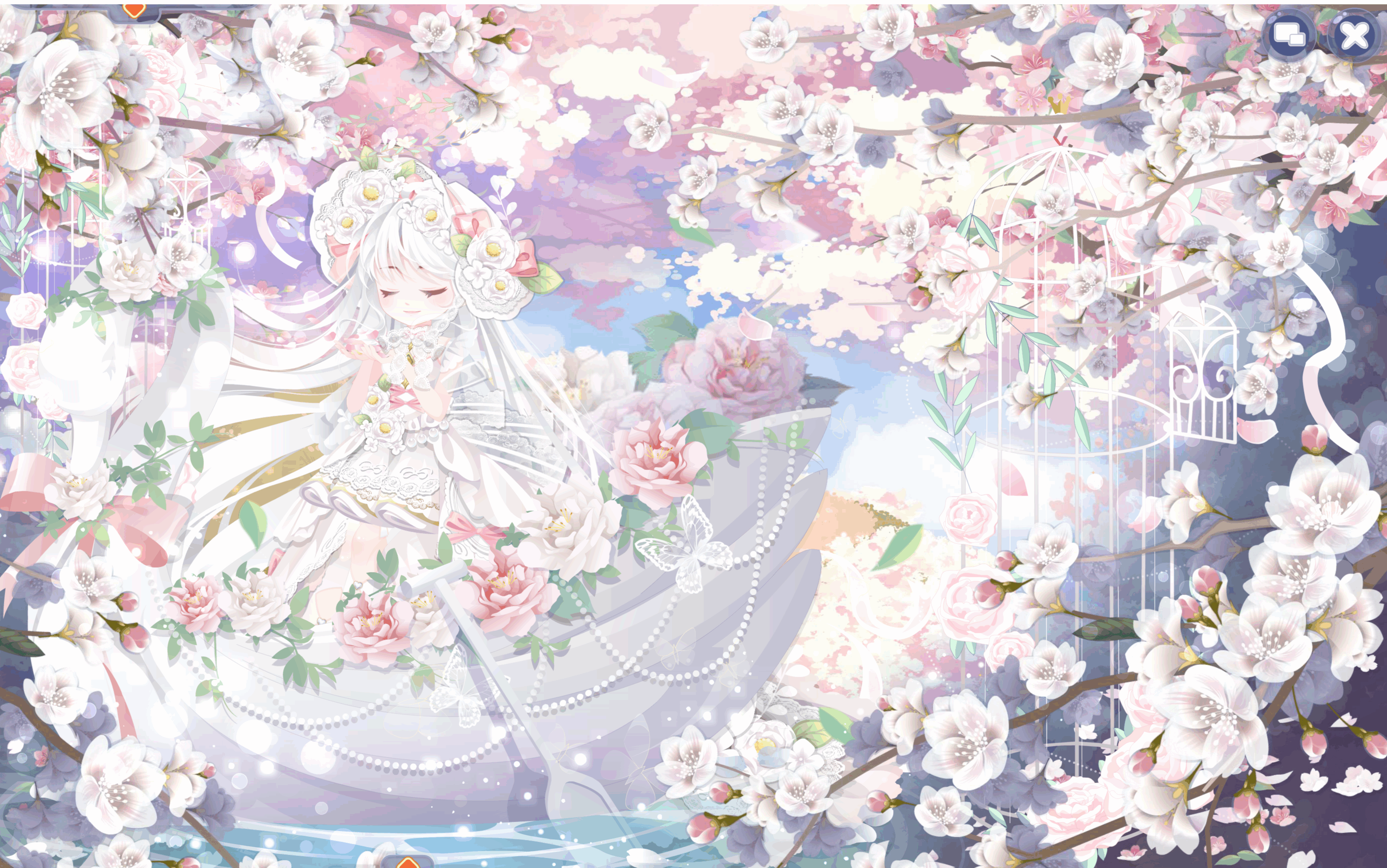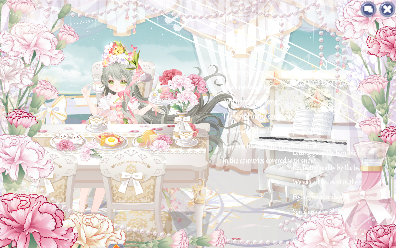 搭配部件:浮花茶话会裙子、浮花茶话会帽子、鱼鱼困倦表情、奶酪甜心左袖、奶酪甜心右袖、琉音浮世发、暖·绽放、幽紫曼纱白长裙、春的花帘、少女梦境光晕、美神油画滤镜、雾香星香薰城堡