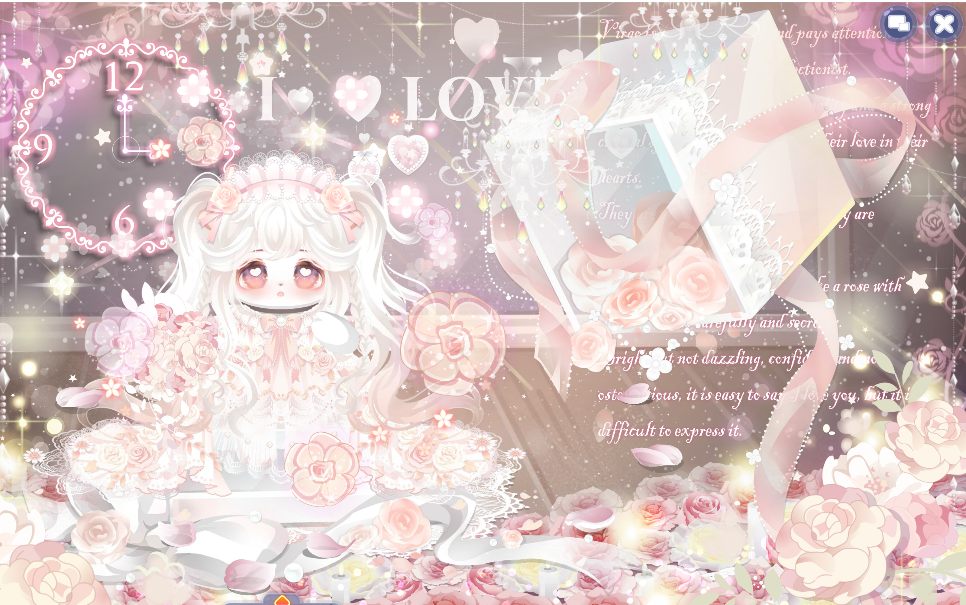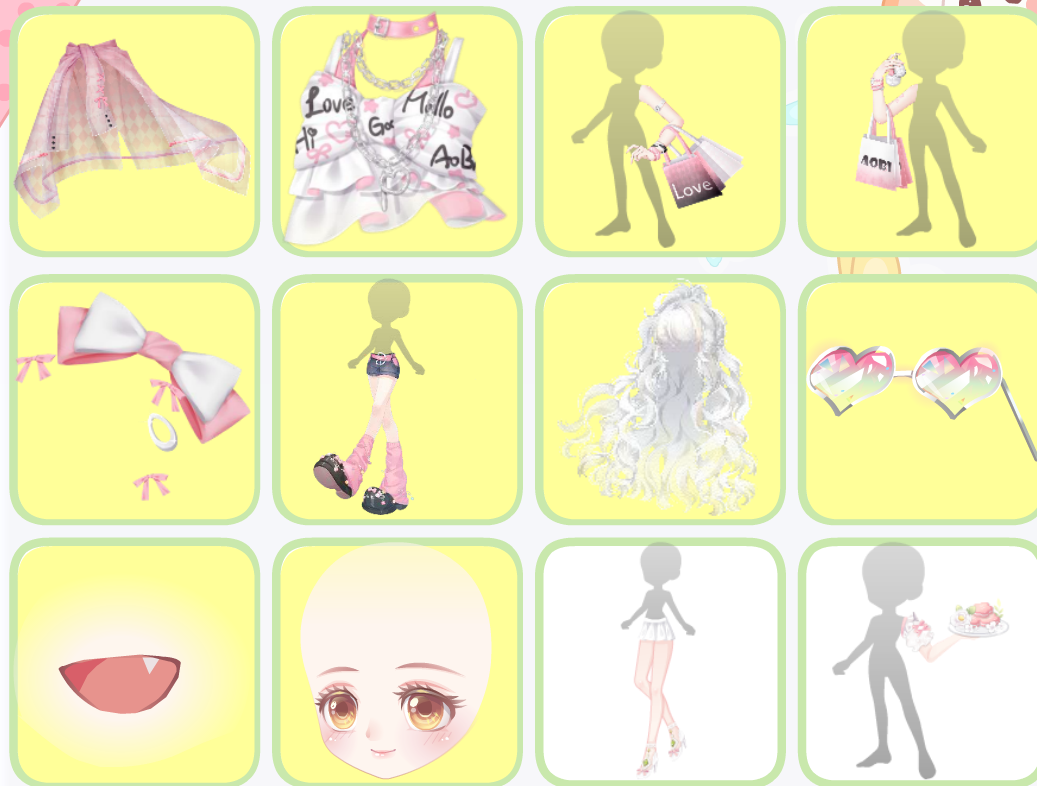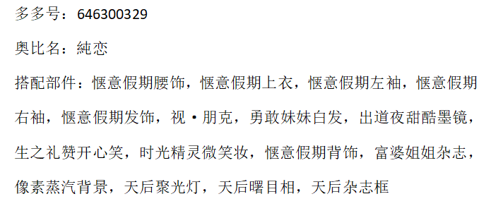 搭配部件:甜心蜜眸、亲爱的公主、爱要说给你听、浪漫恋爱双马尾、时尚记者手姿、儿时光脚满地跑、奥比棕萌皮、妤妤猪花束、阿芙害羞腮红、洋娃娃发箍、可可小姐山茶花、花漾礼匣漫舞、儿时温馨的房间、花落铃兰花瓣、处()女座秘密星言、绒馨流珠宝石灯、阳阳的闪光点点、妤妤猪花丛、浪漫小屋照片墙、萌萌花兔时钟、萌萌花兔光效、奥地利公主光效